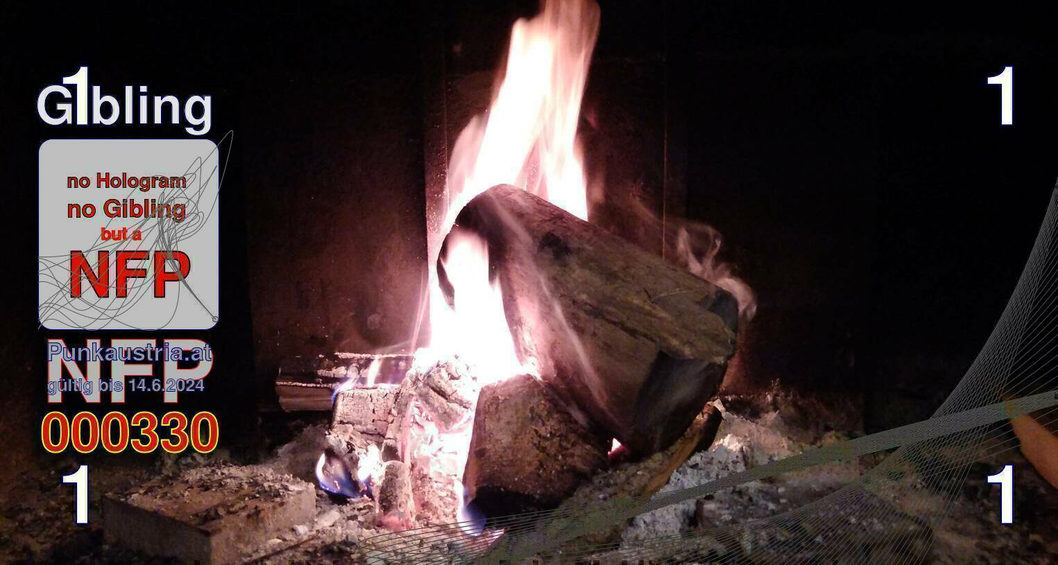 | Caption-Abstract | NFP stays for "Non Fungible Picture". The 11th Edition of our community currency Gibling is built on series of unique pictures. Each image file is unique by serial number and has a own a sha256 checksum. This data is stored in the metatags of the next picture of the series. In the metatags of the first image of the series you can find this text signed in our cryptocurrency Givecoin, created in 2014; NFPs is a fork of the Givecoin blockchain. With the NFPs we extend our ECO system in the context of process art. In this way, the Infolab of the Stadtwerkstatt wants to show another critical position on the logical truths in the new digital information society. The serial number of this image is 000330 and can also be found in the metatag "Original Transmission Reference". The checksum of the previous image is 3bcdd18cc2064a6fb2b54beebfee746e5ad08b36f2ebf995adee57dee8399b01 and is also stored in the metatag: "Edit Status". Your bitcoinaddress: 14oWWxfgq9JXmqFWp5Tsezuf2mr29JqYoU. Your Givecoinaddress:Is printed on the back of the Gibling. To keep the process open, visit https://gibling.stwst.at and follow the instructions." |