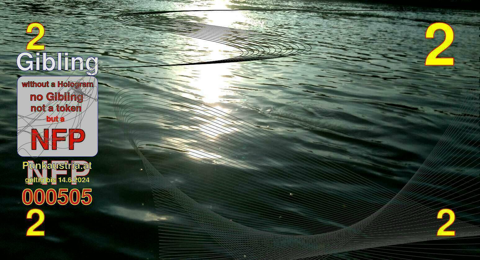 | Caption-Abstract | NFP stays for "Non Fungible Picture". The 11th Edition of our community currency Gibling is built on series of unique pictures. Each image file is unique by serial number and has a own a sha256 checksum. This data is stored in the metatags of the next picture of the series. In the metatags of the first image of the series you can find this text signed in our cryptocurrency Givecoin, created in 2014; NFPs is a fork of the Givecoin blockchain. With the NFPs we extend our ECO system in the context of process art. In this way, the Infolab of the Stadtwerkstatt wants to show another critical position on the logical truths in the new digital information society. The serial number of this image is 000505 and can also be found in the metatag "Original Transmission Reference". The checksum of the previous image is 325f9615aeb70b365dd99ab03bfc99c24f6e317f061306282e1fef37ff31439d and is also stored in the metatag: "Edit Status". Your bitcoinaddress: 17RK3pEkL7xVuBW1U1NEEvJVhm7cCxnNUf. Your Givecoinaddress:Is printed on the back of the Gibling. To keep the process open, visit https://gibling.stwst.at and follow the instructions." |