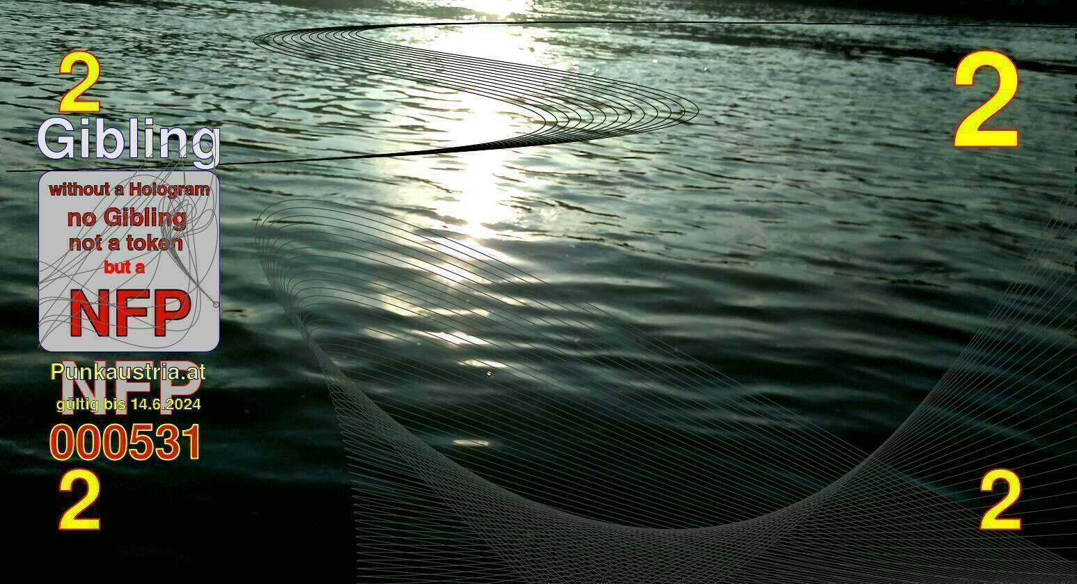 | Caption-Abstract | NFP stays for "Non Fungible Picture". The 11th Edition of our community currency Gibling is built on series of unique pictures. Each image file is unique by serial number and has a own a sha256 checksum. This data is stored in the metatags of the next picture of the series. In the metatags of the first image of the series you can find this text signed in our cryptocurrency Givecoin, created in 2014; NFPs is a fork of the Givecoin blockchain. With the NFPs we extend our ECO system in the context of process art. In this way, the Infolab of the Stadtwerkstatt wants to show another critical position on the logical truths in the new digital information society. The serial number of this image is 000531 and can also be found in the metatag "Original Transmission Reference". The checksum of the previous image is d0d5d26f7c0d9591100dbb29e0339b169d6edee51498f359e29ada21f3768ea5 and is also stored in the metatag: "Edit Status". Your bitcoinaddress: 17hT86CZzSJoieE6KAadPkZuyg9h9AejG3. Your Givecoinaddress:Is printed on the back of the Gibling. To keep the process open, visit https://gibling.stwst.at and follow the instructions." |