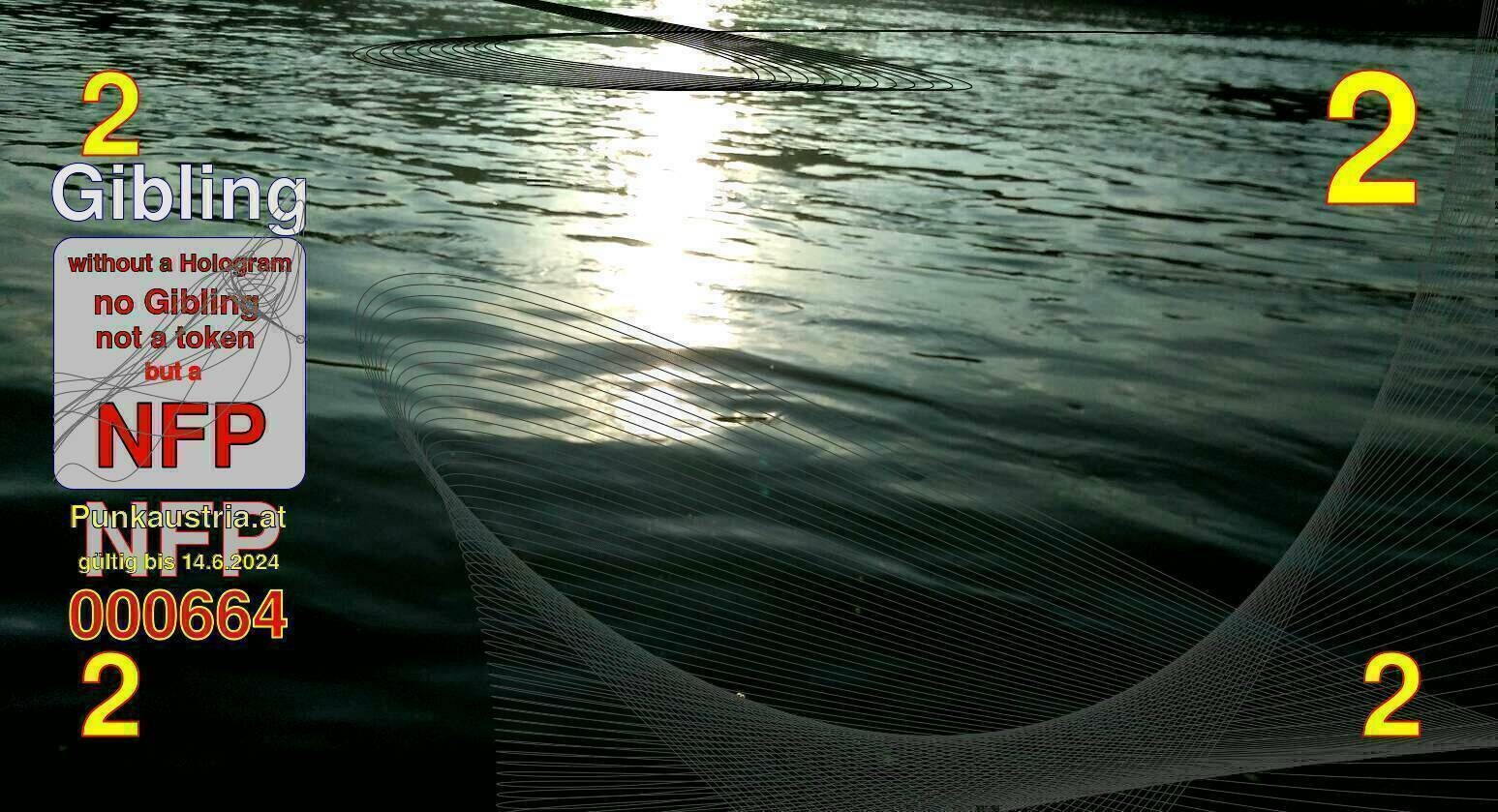 | Caption-Abstract | NFP stays for "Non Fungible Picture". The 11th Edition of our community currency Gibling is built on series of unique pictures. Each image file is unique by serial number and has a own a sha256 checksum. This data is stored in the metatags of the next picture of the series. In the metatags of the first image of the series you can find this text signed in our cryptocurrency Givecoin, created in 2014; NFPs is a fork of the Givecoin blockchain. With the NFPs we extend our ECO system in the context of process art. In this way, the Infolab of the Stadtwerkstatt wants to show another critical position on the logical truths in the new digital information society. The serial number of this image is 000664 and can also be found in the metatag "Original Transmission Reference". The checksum of the previous image is 8172ec3dfb027bb2574aba7ea50ef03efdd6c6a5fadb7cbc7f996d4048ca9ef2 and is also stored in the metatag: "Edit Status". Your bitcoinaddress: 19YwQcCi3nFMD8xFzFFqvA1DGaYwFtf3iS. Your Givecoinaddress:Is printed on the back of the Gibling. To keep the process open, visit https://gibling.stwst.at and follow the instructions." |