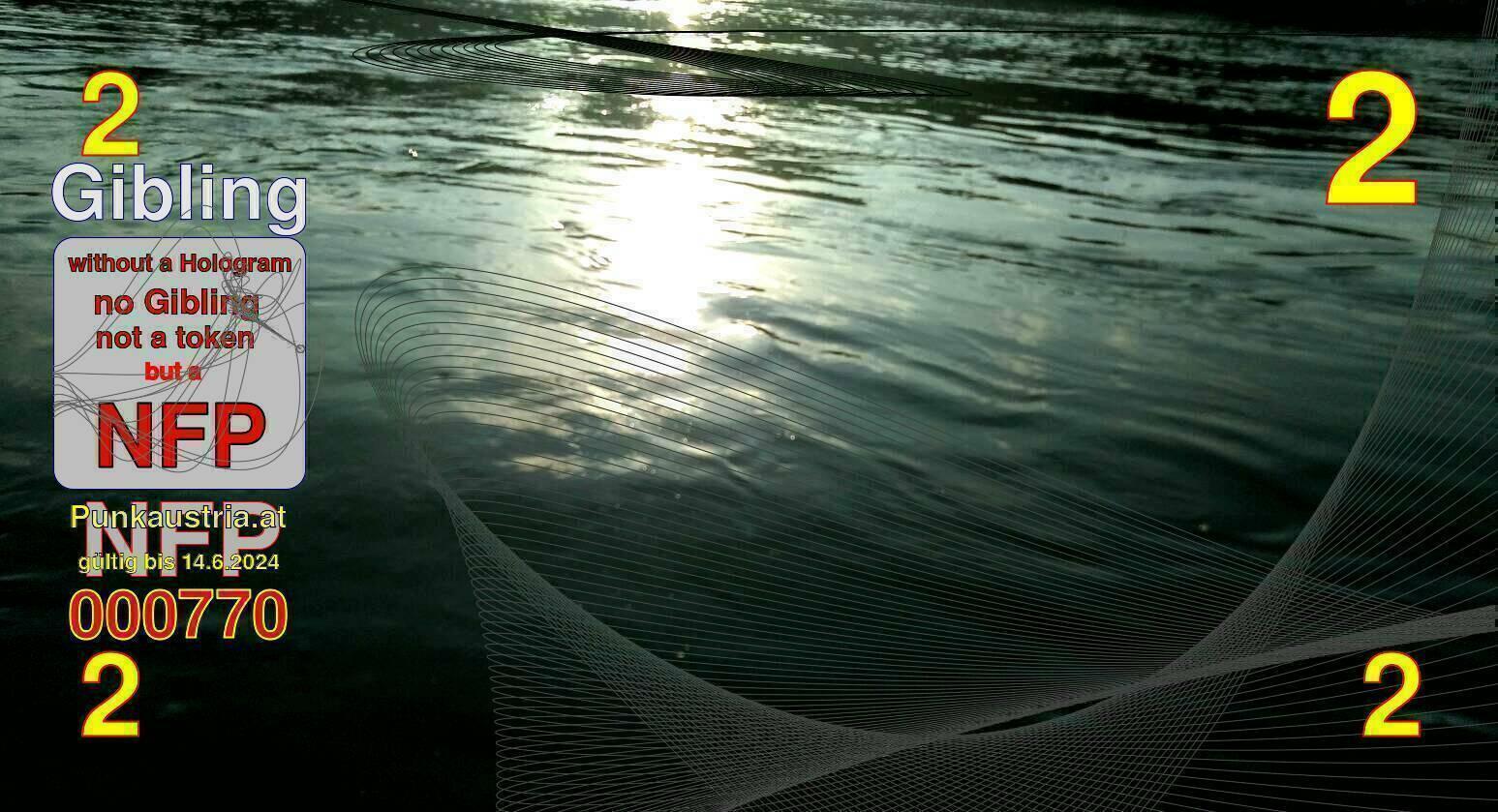 | Caption-Abstract | NFP stays for "Non Fungible Picture". The 11th Edition of our community currency Gibling is built on series of unique pictures. Each image file is unique by serial number and has a own a sha256 checksum. This data is stored in the metatags of the next picture of the series. In the metatags of the first image of the series you can find this text signed in our cryptocurrency Givecoin, created in 2014; NFPs is a fork of the Givecoin blockchain. With the NFPs we extend our ECO system in the context of process art. In this way, the Infolab of the Stadtwerkstatt wants to show another critical position on the logical truths in the new digital information society. The serial number of this image is 000770 and can also be found in the metatag "Original Transmission Reference". The checksum of the previous image is b8e396a5c81a7a5a4f76c10aebea022a5879e78a4f3991cd05038100f6684753 and is also stored in the metatag: "Edit Status". Your bitcoinaddress: 1AgjcbmGFyaBTgNKjCXJ4rAuMjLGvhQUoj. Your Givecoinaddress:Is printed on the back of the Gibling. To keep the process open, visit https://gibling.stwst.at and follow the instructions." |