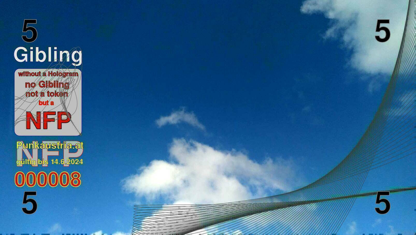 | Caption-Abstract | NFP stays for "Non Fungible Picture". The 11th Edition of our community currency Gibling is built on series of unique pictures. Each image file is unique by serial number and has a own a sha256 checksum. This data is stored in the metatags of the next picture of the series. In the metatags of the first image of the series you can find this text signed in our cryptocurrency Givecoin, created in 2014; NFPs is a fork of the Givecoin blockchain. With the NFPs we extend our ECO system in the context of process art. In this way, the Infolab of the Stadtwerkstatt wants to show another critical position on the logical truths in the new digital information society. The serial number of this image is 000008 and can also be found in the metatag "Original Transmission Reference". The checksum of the previous image is 898ff2d30a96766b61c9b9bc24a8ca5194457094b0b9d80010228d5509dc3df5 and is also stored in the metatag: "Edit Status". Your bitcoinaddress: 17muuM59KRBp9pWbHztCmCVVWYiz1cxJd. Your Givecoinaddress:Is printed on the back of the Gibling. To keep the process open, visit https://gibling.stwst.at and follow the instructions." |