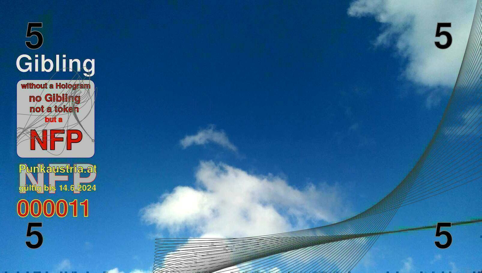 | Caption-Abstract | NFP stays for "Non Fungible Picture". The 11th Edition of our community currency Gibling is built on series of unique pictures. Each image file is unique by serial number and has a own a sha256 checksum. This data is stored in the metatags of the next picture of the series. In the metatags of the first image of the series you can find this text signed in our cryptocurrency Givecoin, created in 2014; NFPs is a fork of the Givecoin blockchain. With the NFPs we extend our ECO system in the context of process art. In this way, the Infolab of the Stadtwerkstatt wants to show another critical position on the logical truths in the new digital information society. The serial number of this image is 000011 and can also be found in the metatag "Original Transmission Reference". The checksum of the previous image is ba08c96e85d59419d483061d4bac3afadb34c1cd57caa4035776b9d5593589fa and is also stored in the metatag: "Edit Status". Your bitcoinaddress: 19HKzCGZnZyfHuPgTiHNPCMut1WTA6Whv. Your Givecoinaddress:Is printed on the back of the Gibling. To keep the process open, visit https://gibling.stwst.at and follow the instructions." |