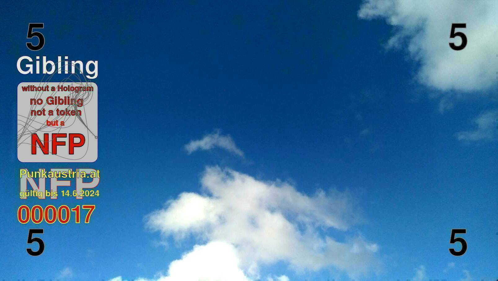 | Caption-Abstract | NFP stays for "Non Fungible Picture". The 11th Edition of our community currency Gibling is built on series of unique pictures. Each image file is unique by serial number and has a own a sha256 checksum. This data is stored in the metatags of the next picture of the series. In the metatags of the first image of the series you can find this text signed in our cryptocurrency Givecoin, created in 2014; NFPs is a fork of the Givecoin blockchain. With the NFPs we extend our ECO system in the context of process art. In this way, the Infolab of the Stadtwerkstatt wants to show another critical position on the logical truths in the new digital information society. The serial number of this image is 000017 and can also be found in the metatag "Original Transmission Reference". The checksum of the previous image is 2dfdbd9d2576ecc067c646e0b8d8b26b9599bed38eeb0e787af8b1bf1555a120 and is also stored in the metatag: "Edit Status". Your bitcoinaddress: 1D5GcMpzAo3kjoCc5BNPsTZnbXb2n38P7. Your Givecoinaddress:Is printed on the back of the Gibling. To keep the process open, visit https://gibling.stwst.at and follow the instructions." |