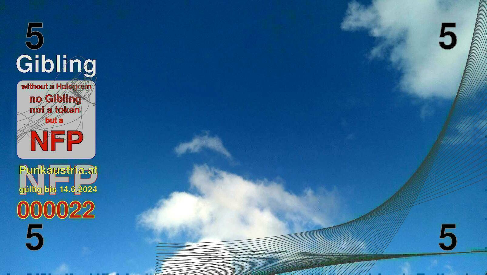| Caption-Abstract | NFP stays for "Non Fungible Picture". The 11th Edition of our community currency Gibling is built on series of unique pictures. Each image file is unique by serial number and has a own a sha256 checksum. This data is stored in the metatags of the next picture of the series. In the metatags of the first image of the series you can find this text signed in our cryptocurrency Givecoin, created in 2014; NFPs is a fork of the Givecoin blockchain. With the NFPs we extend our ECO system in the context of process art. In this way, the Infolab of the Stadtwerkstatt wants to show another critical position on the logical truths in the new digital information society. The serial number of this image is 000022 and can also be found in the metatag "Original Transmission Reference". The checksum of the previous image is 50d7da3d195a0330a7b928fec8a5738bc76d1c900d7672dc0819fa916e5b6b9f and is also stored in the metatag: "Edit Status". Your bitcoinaddress: 1Fe1m97YWxvKCLpBSs6uKZ3ZYB2dDYFMt. Your Givecoinaddress:Is printed on the back of the Gibling. To keep the process open, visit https://gibling.stwst.at and follow the instructions." |