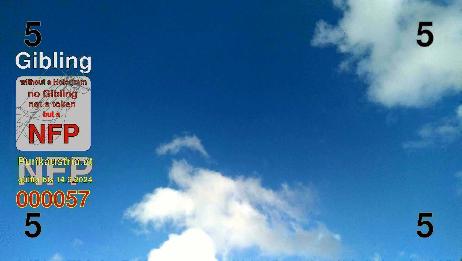 | Caption-Abstract | NFP stays for "Non Fungible Picture". The 11th Edition of our community currency Gibling is built on series of unique pictures. Each image file is unique by serial number and has a own a sha256 checksum. This data is stored in the metatags of the next picture of the series. In the metatags of the first image of the series you can find this text signed in our cryptocurrency Givecoin, created in 2014; NFPs is a fork of the Givecoin blockchain. With the NFPs we extend our ECO system in the context of process art. In this way, the Infolab of the Stadtwerkstatt wants to show another critical position on the logical truths in the new digital information society. The serial number of this image is 000057 and can also be found in the metatag "Original Transmission Reference". The checksum of the previous image is 8237af6671b02c219109f738fd9ca211240c67d28cfaadd217f3185b62f3abbc and is also stored in the metatag: "Edit Status". Your bitcoinaddress: 1d9vBQYDnywa8cmvPaQ4rMvRPtoRvh1ft. Your Givecoinaddress:Is printed on the back of the Gibling. To keep the process open, visit https://gibling.stwst.at and follow the instructions." |