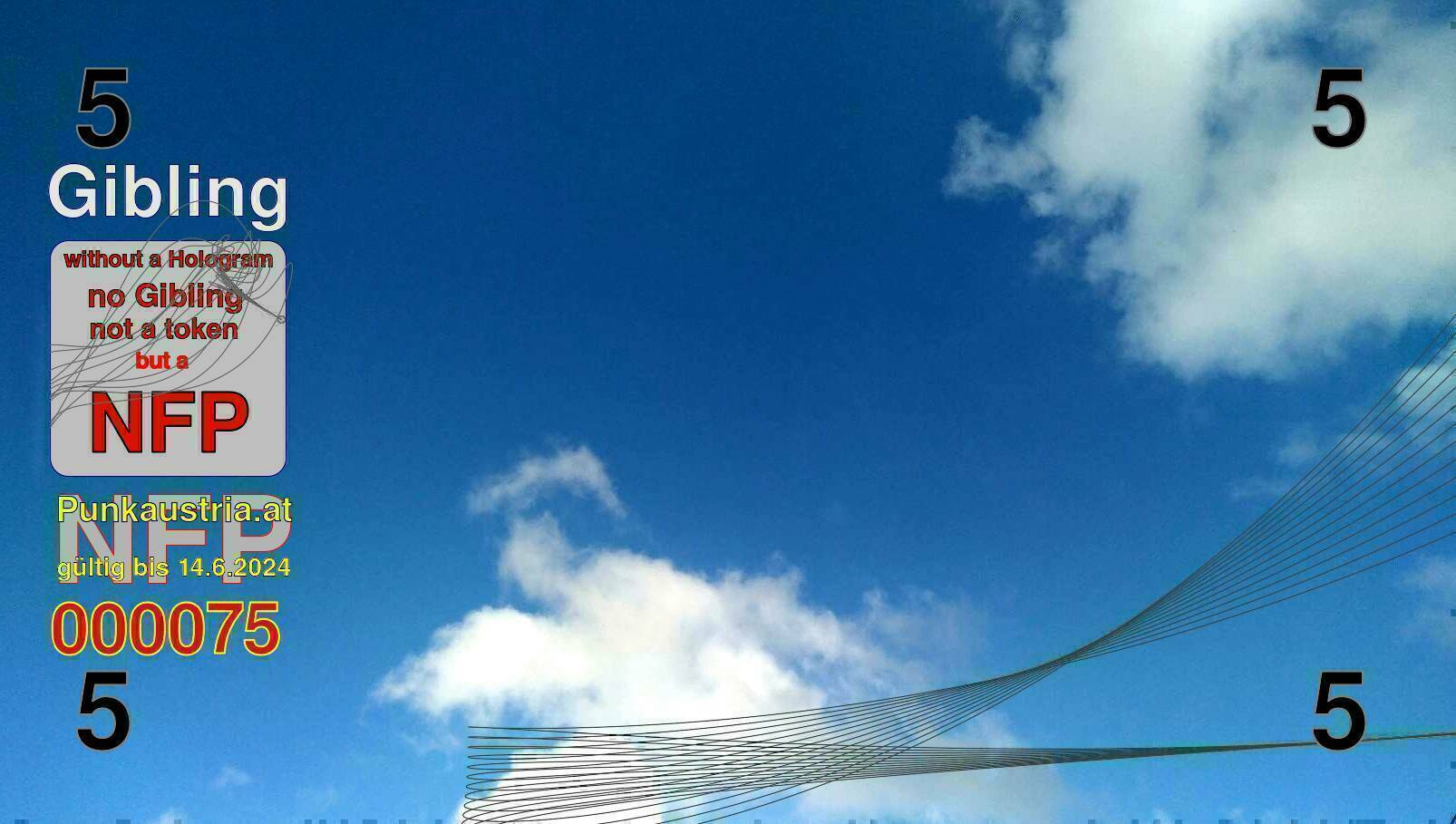 | Caption-Abstract | NFP stays for "Non Fungible Picture". The 11th Edition of our community currency Gibling is built on series of unique pictures. Each image file is unique by serial number and has a own a sha256 checksum. This data is stored in the metatags of the next picture of the series. In the metatags of the first image of the series you can find this text signed in our cryptocurrency Givecoin, created in 2014; NFPs is a fork of the Givecoin blockchain. With the NFPs we extend our ECO system in the context of process art. In this way, the Infolab of the Stadtwerkstatt wants to show another critical position on the logical truths in the new digital information society. The serial number of this image is 000075 and can also be found in the metatag "Original Transmission Reference". The checksum of the previous image is fd74928c20016f0c4211bd704a4ad5cf74d13d603f63551156b5e1269d8bcc5b and is also stored in the metatag: "Edit Status". Your bitcoinaddress: 1u5d7FggbxLdhsoaKenqNXELy4Rd6M7u4. Your Givecoinaddress:Is printed on the back of the Gibling. To keep the process open, visit https://gibling.stwst.at and follow the instructions." |