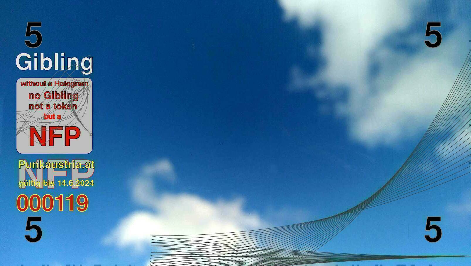 | Caption-Abstract | NFP stays for "Non Fungible Picture". The 11th Edition of our community currency Gibling is built on series of unique pictures. Each image file is unique by serial number and has a own a sha256 checksum. This data is stored in the metatags of the next picture of the series. In the metatags of the first image of the series you can find this text signed in our cryptocurrency Givecoin, created in 2014; NFPs is a fork of the Givecoin blockchain. With the NFPs we extend our ECO system in the context of process art. In this way, the Infolab of the Stadtwerkstatt wants to show another critical position on the logical truths in the new digital information society. The serial number of this image is 000119 and can also be found in the metatag "Original Transmission Reference". The checksum of the previous image is a5dc669a68dacc2eb06a88ad85b11a6a4119da3ac4499854dfeb64b28b72cff5 and is also stored in the metatag: "Edit Status". Your bitcoinaddress: 12NKyh639MgJ68Df7JAyVG8HyFyMBheLYK. Your Givecoinaddress:Is printed on the back of the Gibling. To keep the process open, visit https://gibling.stwst.at and follow the instructions." |
