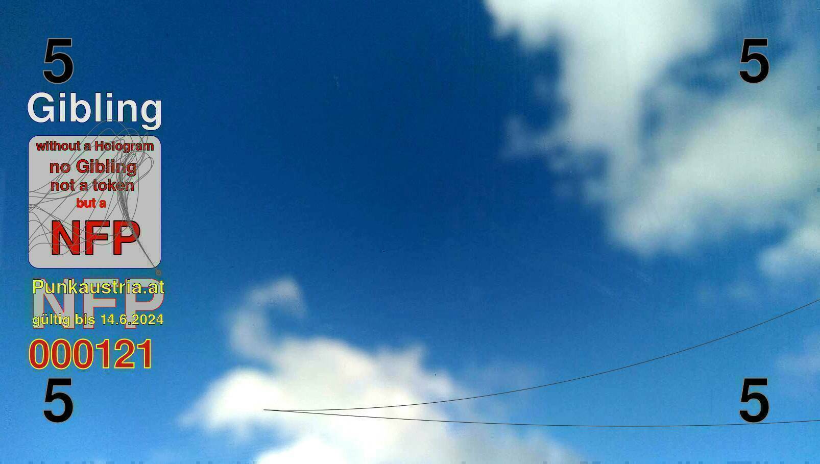 | Caption-Abstract | NFP stays for "Non Fungible Picture". The 11th Edition of our community currency Gibling is built on series of unique pictures. Each image file is unique by serial number and has a own a sha256 checksum. This data is stored in the metatags of the next picture of the series. In the metatags of the first image of the series you can find this text signed in our cryptocurrency Givecoin, created in 2014; NFPs is a fork of the Givecoin blockchain. With the NFPs we extend our ECO system in the context of process art. In this way, the Infolab of the Stadtwerkstatt wants to show another critical position on the logical truths in the new digital information society. The serial number of this image is 000121 and can also be found in the metatag "Original Transmission Reference". The checksum of the previous image is 39d7cb2a961c31fdeb98039d64080cd43c80523dca52c32761294296fc88911d and is also stored in the metatag: "Edit Status". Your bitcoinaddress: 12PAFJjT5yVR1XBRMizjc2xgNKao4b2Jro. Your Givecoinaddress:Is printed on the back of the Gibling. To keep the process open, visit https://gibling.stwst.at and follow the instructions." |