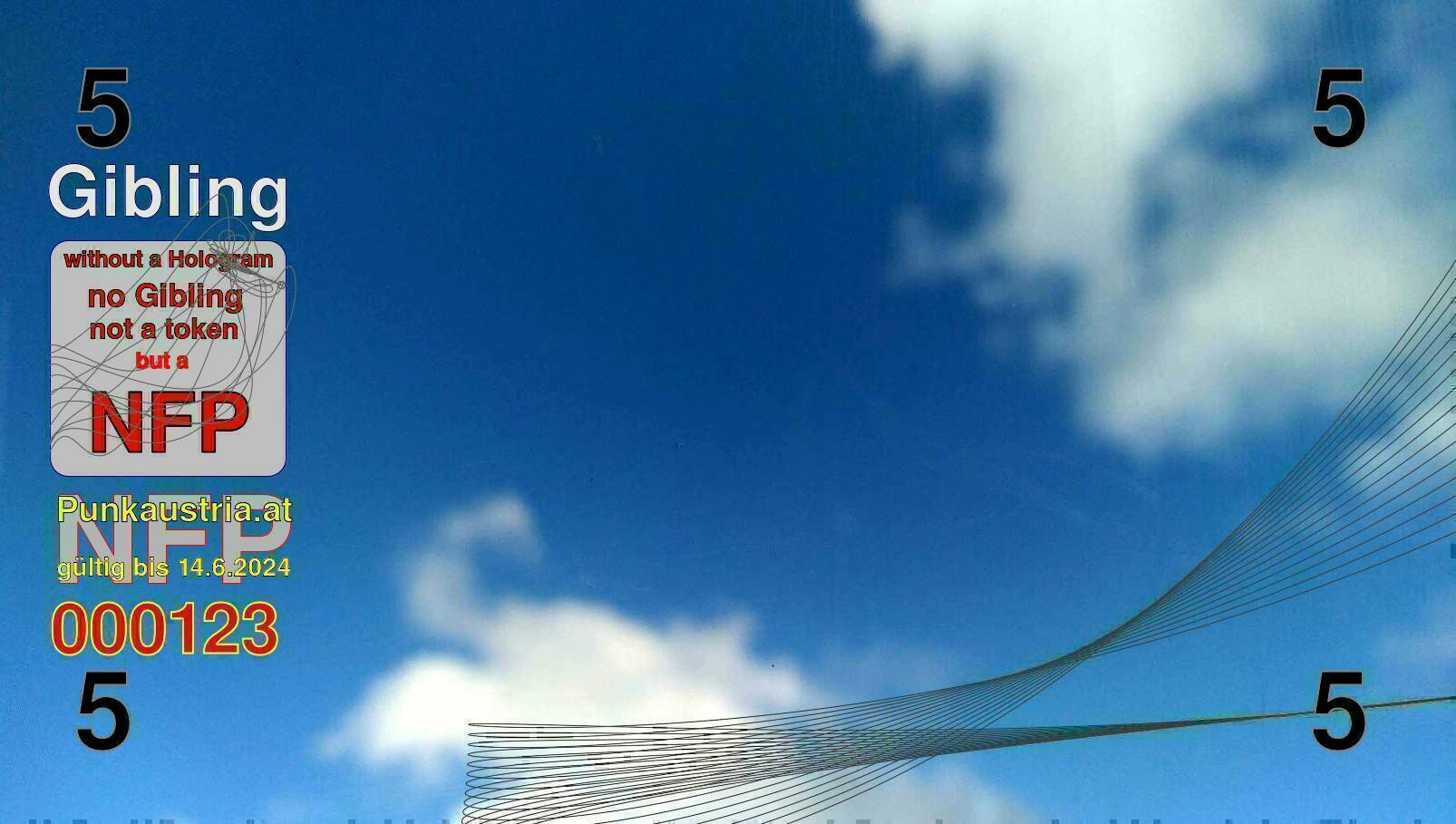 | Caption-Abstract | NFP stays for "Non Fungible Picture". The 11th Edition of our community currency Gibling is built on series of unique pictures. Each image file is unique by serial number and has a own a sha256 checksum. This data is stored in the metatags of the next picture of the series. In the metatags of the first image of the series you can find this text signed in our cryptocurrency Givecoin, created in 2014; NFPs is a fork of the Givecoin blockchain. With the NFPs we extend our ECO system in the context of process art. In this way, the Infolab of the Stadtwerkstatt wants to show another critical position on the logical truths in the new digital information society. The serial number of this image is 000123 and can also be found in the metatag "Original Transmission Reference". The checksum of the previous image is 0b3eb3bbe9cfce9fae53436a6201efb44aec024ad7ba0019632fc5fc579b279b and is also stored in the metatag: "Edit Status". Your bitcoinaddress: 12RRHpNukMB5m7YNSZgh5dHQDdKNjmbobm. Your Givecoinaddress:Is printed on the back of the Gibling. To keep the process open, visit https://gibling.stwst.at and follow the instructions." |
