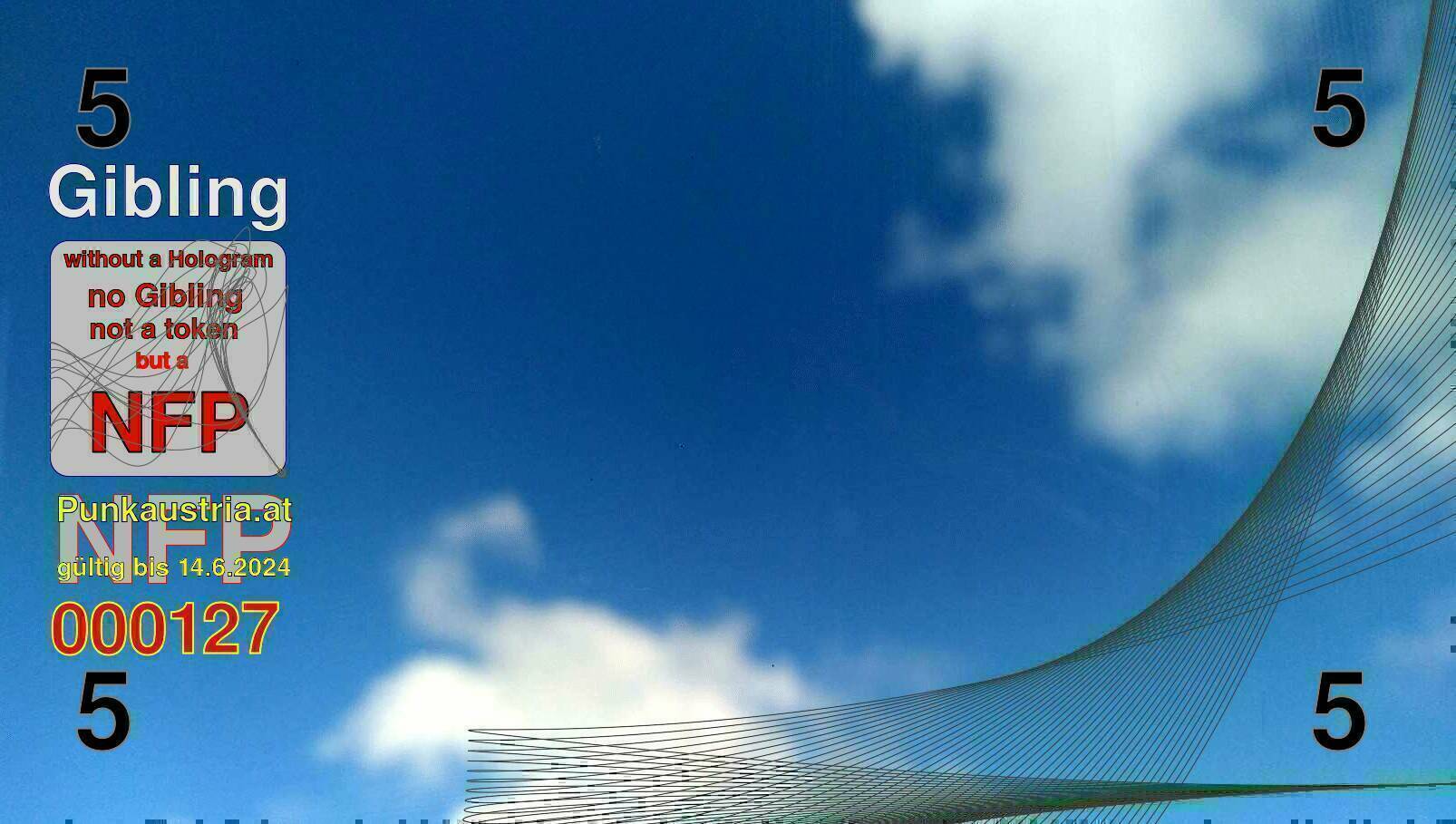 | Caption-Abstract | NFP stays for "Non Fungible Picture". The 11th Edition of our community currency Gibling is built on series of unique pictures. Each image file is unique by serial number and has a own a sha256 checksum. This data is stored in the metatags of the next picture of the series. In the metatags of the first image of the series you can find this text signed in our cryptocurrency Givecoin, created in 2014; NFPs is a fork of the Givecoin blockchain. With the NFPs we extend our ECO system in the context of process art. In this way, the Infolab of the Stadtwerkstatt wants to show another critical position on the logical truths in the new digital information society. The serial number of this image is 000127 and can also be found in the metatag "Original Transmission Reference". The checksum of the previous image is 47ab468205a7d9aa156d197c4f7e93c3a94b93659e1cb2643ecc5917f58100c5 and is also stored in the metatag: "Edit Status". Your bitcoinaddress: 12TtQ5111BL4ziuJrL12xDv8aDngVv65Jc. Your Givecoinaddress:Is printed on the back of the Gibling. To keep the process open, visit https://gibling.stwst.at and follow the instructions." |