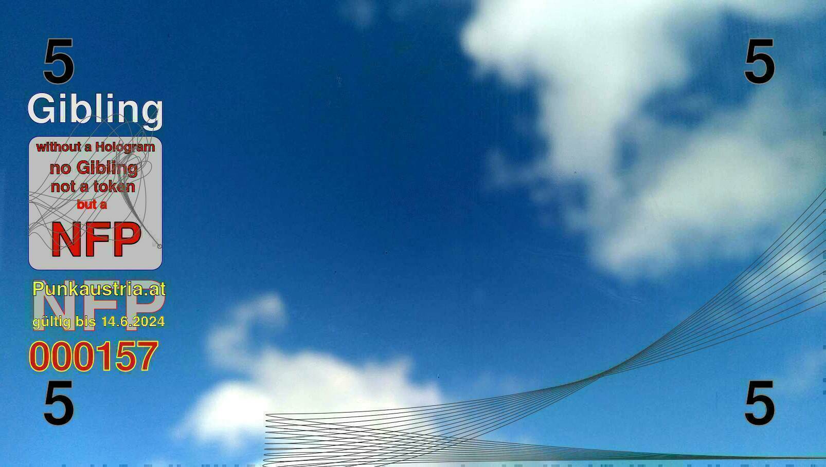 | Caption-Abstract | NFP stays for "Non Fungible Picture". The 11th Edition of our community currency Gibling is built on series of unique pictures. Each image file is unique by serial number and has a own a sha256 checksum. This data is stored in the metatags of the next picture of the series. In the metatags of the first image of the series you can find this text signed in our cryptocurrency Givecoin, created in 2014; NFPs is a fork of the Givecoin blockchain. With the NFPs we extend our ECO system in the context of process art. In this way, the Infolab of the Stadtwerkstatt wants to show another critical position on the logical truths in the new digital information society. The serial number of this image is 000157 and can also be found in the metatag "Original Transmission Reference". The checksum of the previous image is d415586d961cbcb96680f44aa03f0e0affed92463a88d9aed14c29096328c7e9 and is also stored in the metatag: "Edit Status". Your bitcoinaddress: 12qLQr4qN3ckCpXmf65SwvDELQG5CX93YZ. Your Givecoinaddress:Is printed on the back of the Gibling. To keep the process open, visit https://gibling.stwst.at and follow the instructions." |