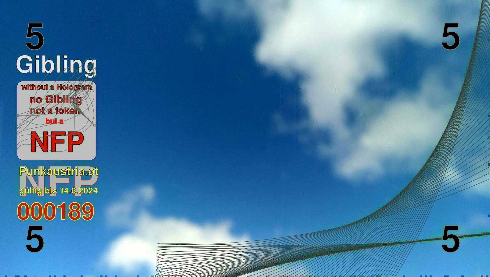 | Caption-Abstract | NFP stays for "Non Fungible Picture". The 11th Edition of our community currency Gibling is built on series of unique pictures. Each image file is unique by serial number and has a own a sha256 checksum. This data is stored in the metatags of the next picture of the series. In the metatags of the first image of the series you can find this text signed in our cryptocurrency Givecoin, created in 2014; NFPs is a fork of the Givecoin blockchain. With the NFPs we extend our ECO system in the context of process art. In this way, the Infolab of the Stadtwerkstatt wants to show another critical position on the logical truths in the new digital information society. The serial number of this image is 000189 and can also be found in the metatag "Original Transmission Reference". The checksum of the previous image is 85747fa588ceec3ba1f49e7676edcc59a2680fa011d56146b077f87f97113188 and is also stored in the metatag: "Edit Status". Your bitcoinaddress: 139Sbhww4mP773Z1Fxg75PG71VyV5DGj63. Your Givecoinaddress:Is printed on the back of the Gibling. To keep the process open, visit https://gibling.stwst.at and follow the instructions." |