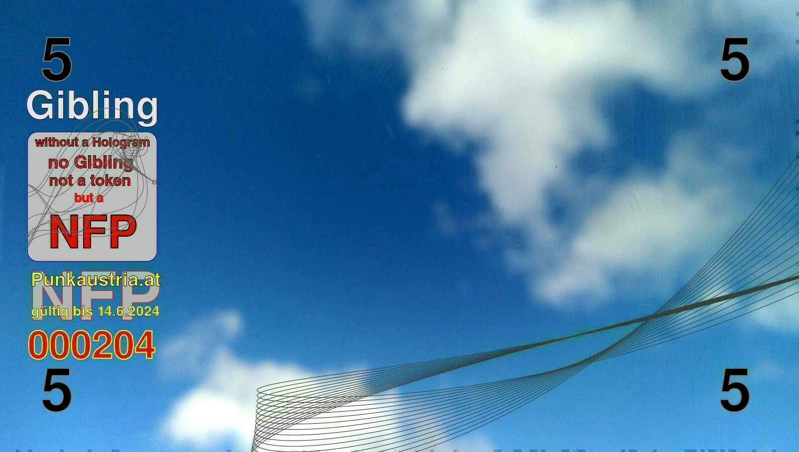 | Caption-Abstract | NFP stays for "Non Fungible Picture". The 11th Edition of our community currency Gibling is built on series of unique pictures. Each image file is unique by serial number and has a own a sha256 checksum. This data is stored in the metatags of the next picture of the series. In the metatags of the first image of the series you can find this text signed in our cryptocurrency Givecoin, created in 2014; NFPs is a fork of the Givecoin blockchain. With the NFPs we extend our ECO system in the context of process art. In this way, the Infolab of the Stadtwerkstatt wants to show another critical position on the logical truths in the new digital information society. The serial number of this image is 000204 and can also be found in the metatag "Original Transmission Reference". The checksum of the previous image is 21f894ba88c2e26270fd32867fbd70c8e0f68d13911ba18a8ad77aa26f231691 and is also stored in the metatag: "Edit Status". Your bitcoinaddress: 13PJH5bs5DYbiQpSrzwPXgXb1SBwvFcjqU. Your Givecoinaddress:Is printed on the back of the Gibling. To keep the process open, visit https://gibling.stwst.at and follow the instructions." |