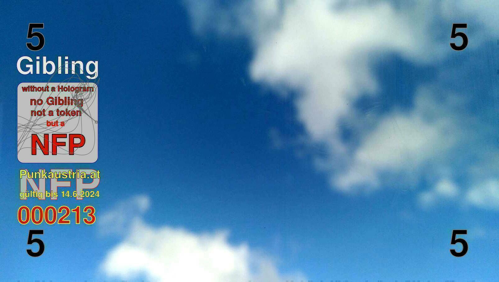 | Caption-Abstract | NFP stays for "Non Fungible Picture". The 11th Edition of our community currency Gibling is built on series of unique pictures. Each image file is unique by serial number and has a own a sha256 checksum. This data is stored in the metatags of the next picture of the series. In the metatags of the first image of the series you can find this text signed in our cryptocurrency Givecoin, created in 2014; NFPs is a fork of the Givecoin blockchain. With the NFPs we extend our ECO system in the context of process art. In this way, the Infolab of the Stadtwerkstatt wants to show another critical position on the logical truths in the new digital information society. The serial number of this image is 000213 and can also be found in the metatag "Original Transmission Reference". The checksum of the previous image is ca9bf98c8e99e6e9e8bdc6bd440693113ff1d250d61de4d825068b0a153e992f and is also stored in the metatag: "Edit Status". Your bitcoinaddress: 13YMtk3iR5FUEpynKE2rh88sMREBxg3yZj. Your Givecoinaddress:Is printed on the back of the Gibling. To keep the process open, visit https://gibling.stwst.at and follow the instructions." |
