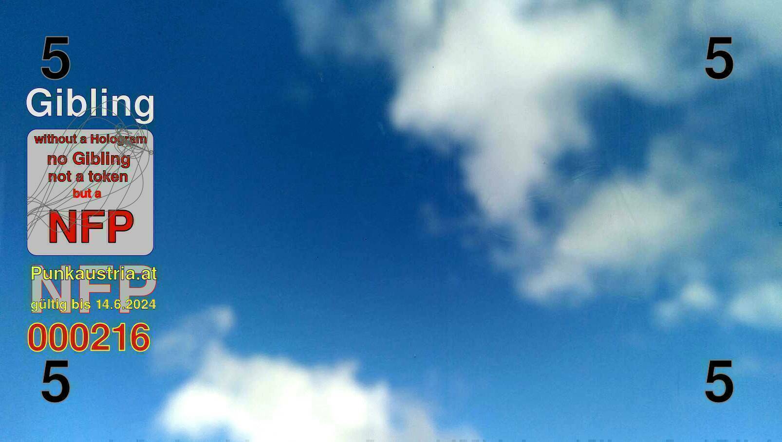 | Caption-Abstract | NFP stays for "Non Fungible Picture". The 11th Edition of our community currency Gibling is built on series of unique pictures. Each image file is unique by serial number and has a own a sha256 checksum. This data is stored in the metatags of the next picture of the series. In the metatags of the first image of the series you can find this text signed in our cryptocurrency Givecoin, created in 2014; NFPs is a fork of the Givecoin blockchain. With the NFPs we extend our ECO system in the context of process art. In this way, the Infolab of the Stadtwerkstatt wants to show another critical position on the logical truths in the new digital information society. The serial number of this image is 000216 and can also be found in the metatag "Original Transmission Reference". The checksum of the previous image is 87e0c50f0c0bf48d6116e2189bd77a0b8bc2bb5bdd9b22bc7ea8f03d389b375d and is also stored in the metatag: "Edit Status". Your bitcoinaddress: 13aQTsYWhM2DiuCxxcRmwuTeRi7YopV5Uu. Your Givecoinaddress:Is printed on the back of the Gibling. To keep the process open, visit https://gibling.stwst.at and follow the instructions." |