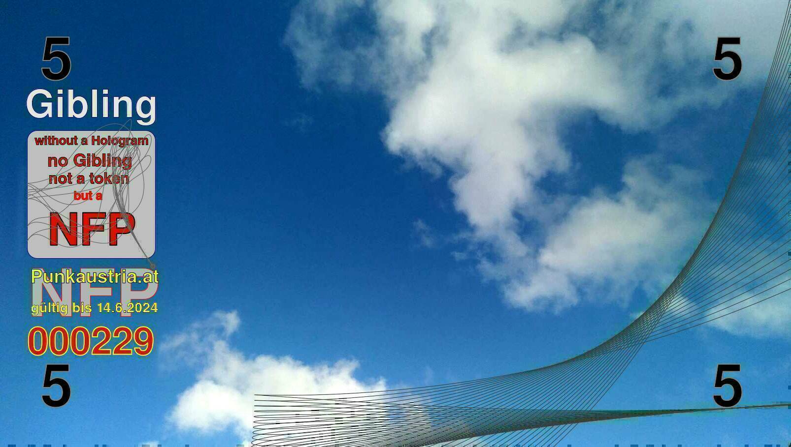 | Caption-Abstract | NFP stays for "Non Fungible Picture". The 11th Edition of our community currency Gibling is built on series of unique pictures. Each image file is unique by serial number and has a own a sha256 checksum. This data is stored in the metatags of the next picture of the series. In the metatags of the first image of the series you can find this text signed in our cryptocurrency Givecoin, created in 2014; NFPs is a fork of the Givecoin blockchain. With the NFPs we extend our ECO system in the context of process art. In this way, the Infolab of the Stadtwerkstatt wants to show another critical position on the logical truths in the new digital information society. The serial number of this image is 000229 and can also be found in the metatag "Original Transmission Reference". The checksum of the previous image is a9a56fad6e26e12841144678e198679dc215384da0a125a6758c8bea74e5c4c8 and is also stored in the metatag: "Edit Status". Your bitcoinaddress: 13qdvmirWJf6ggcRWS4e3AN9uReUeNaQEU. Your Givecoinaddress:Is printed on the back of the Gibling. To keep the process open, visit https://gibling.stwst.at and follow the instructions." |