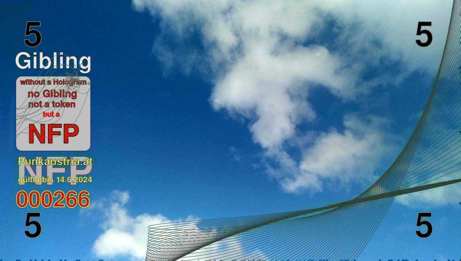 | Caption-Abstract | NFP stays for "Non Fungible Picture". The 11th Edition of our community currency Gibling is built on series of unique pictures. Each image file is unique by serial number and has a own a sha256 checksum. This data is stored in the metatags of the next picture of the series. In the metatags of the first image of the series you can find this text signed in our cryptocurrency Givecoin, created in 2014; NFPs is a fork of the Givecoin blockchain. With the NFPs we extend our ECO system in the context of process art. In this way, the Infolab of the Stadtwerkstatt wants to show another critical position on the logical truths in the new digital information society. The serial number of this image is 000266 and can also be found in the metatag "Original Transmission Reference". The checksum of the previous image is 6bc67c66825ad77a9e0c7826d8f8716b339c7dbdff5ff73c7744232231f9a996 and is also stored in the metatag: "Edit Status". Your bitcoinaddress: 14Fpot1KgujBKsbyFy2tKRzNyxjZxeQfMy. Your Givecoinaddress:Is printed on the back of the Gibling. To keep the process open, visit https://gibling.stwst.at and follow the instructions." |