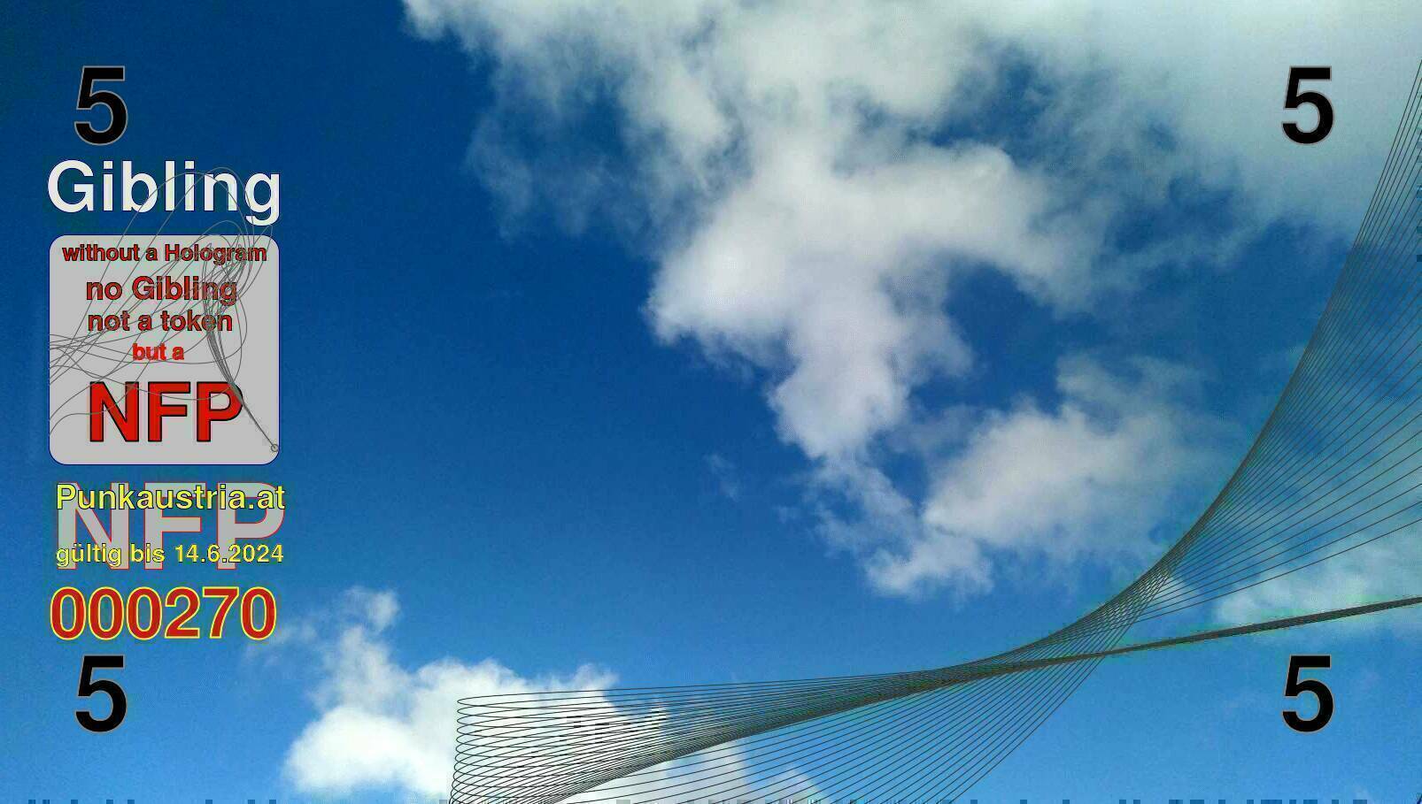 | Caption-Abstract | NFP stays for "Non Fungible Picture". The 11th Edition of our community currency Gibling is built on series of unique pictures. Each image file is unique by serial number and has a own a sha256 checksum. This data is stored in the metatags of the next picture of the series. In the metatags of the first image of the series you can find this text signed in our cryptocurrency Givecoin, created in 2014; NFPs is a fork of the Givecoin blockchain. With the NFPs we extend our ECO system in the context of process art. In this way, the Infolab of the Stadtwerkstatt wants to show another critical position on the logical truths in the new digital information society. The serial number of this image is 000270 and can also be found in the metatag "Original Transmission Reference". The checksum of the previous image is b59b5f0534870137bd2af9685dd5e851b85bb6a8ace6aff98663e799335b87f2 and is also stored in the metatag: "Edit Status". Your bitcoinaddress: 14GhVmjPqhquDWRP9Gkfo2krvSNtzjKkmK. Your Givecoinaddress:Is printed on the back of the Gibling. To keep the process open, visit https://gibling.stwst.at and follow the instructions." |