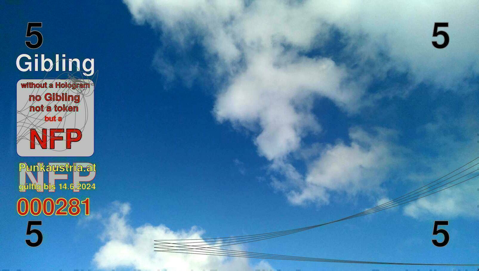 | Caption-Abstract | NFP stays for "Non Fungible Picture". The 11th Edition of our community currency Gibling is built on series of unique pictures. Each image file is unique by serial number and has a own a sha256 checksum. This data is stored in the metatags of the next picture of the series. In the metatags of the first image of the series you can find this text signed in our cryptocurrency Givecoin, created in 2014; NFPs is a fork of the Givecoin blockchain. With the NFPs we extend our ECO system in the context of process art. In this way, the Infolab of the Stadtwerkstatt wants to show another critical position on the logical truths in the new digital information society. The serial number of this image is 000281 and can also be found in the metatag "Original Transmission Reference". The checksum of the previous image is eeb03779c835d654dafa009a628e9b8a0fb58cec063c190ca3bee033b5fd2b72 and is also stored in the metatag: "Edit Status". Your bitcoinaddress: 14Q8YxRmr3Sja1xqySd999fWjE9omeYomQ. Your Givecoinaddress:Is printed on the back of the Gibling. To keep the process open, visit https://gibling.stwst.at and follow the instructions." |