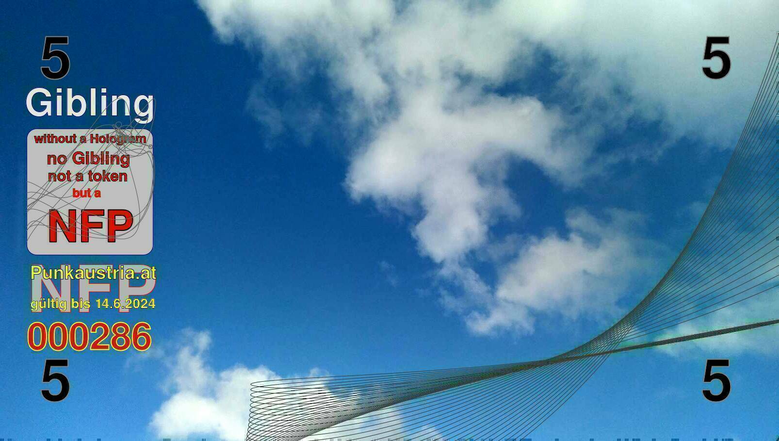 | Caption-Abstract | NFP stays for "Non Fungible Picture". The 11th Edition of our community currency Gibling is built on series of unique pictures. Each image file is unique by serial number and has a own a sha256 checksum. This data is stored in the metatags of the next picture of the series. In the metatags of the first image of the series you can find this text signed in our cryptocurrency Givecoin, created in 2014; NFPs is a fork of the Givecoin blockchain. With the NFPs we extend our ECO system in the context of process art. In this way, the Infolab of the Stadtwerkstatt wants to show another critical position on the logical truths in the new digital information society. The serial number of this image is 000286 and can also be found in the metatag "Original Transmission Reference". The checksum of the previous image is 0516cc48b58912c56df4764bd8256d9b86a69a2c5970bacf49d9de62827ad1b7 and is also stored in the metatag: "Edit Status". Your bitcoinaddress: 14VcMLfuwu9AXDkhWCNnb7MqXhxZmALt4d. Your Givecoinaddress:Is printed on the back of the Gibling. To keep the process open, visit https://gibling.stwst.at and follow the instructions." |