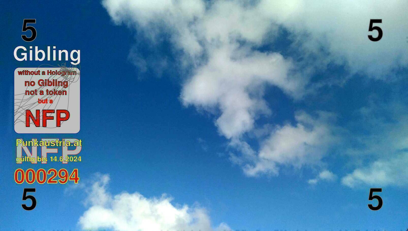 | Caption-Abstract | NFP stays for "Non Fungible Picture". The 11th Edition of our community currency Gibling is built on series of unique pictures. Each image file is unique by serial number and has a own a sha256 checksum. This data is stored in the metatags of the next picture of the series. In the metatags of the first image of the series you can find this text signed in our cryptocurrency Givecoin, created in 2014; NFPs is a fork of the Givecoin blockchain. With the NFPs we extend our ECO system in the context of process art. In this way, the Infolab of the Stadtwerkstatt wants to show another critical position on the logical truths in the new digital information society. The serial number of this image is 000294 and can also be found in the metatag "Original Transmission Reference". The checksum of the previous image is 8f6cf49d21389ec77e6ae10d1d6350da9afe7f4ef7d26480bf89688c26c113a2 and is also stored in the metatag: "Edit Status". Your bitcoinaddress: 14Z7XUjaEW49g2hjgCkZtAFz3SFG1sJkUC. Your Givecoinaddress:Is printed on the back of the Gibling. To keep the process open, visit https://gibling.stwst.at and follow the instructions." |