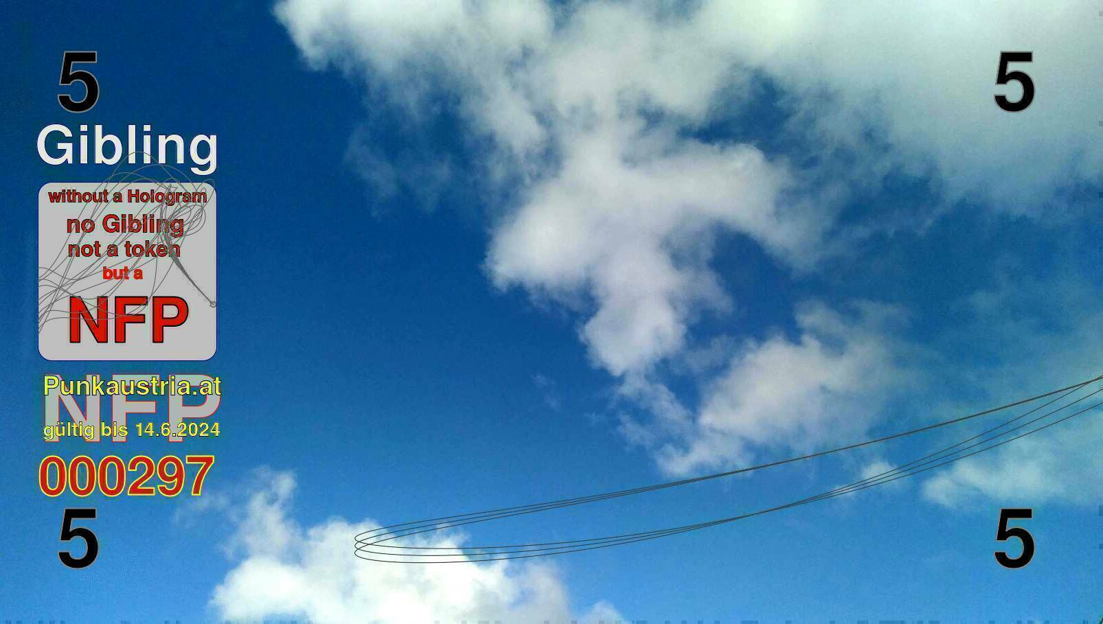 | Caption-Abstract | NFP stays for "Non Fungible Picture". The 11th Edition of our community currency Gibling is built on series of unique pictures. Each image file is unique by serial number and has a own a sha256 checksum. This data is stored in the metatags of the next picture of the series. In the metatags of the first image of the series you can find this text signed in our cryptocurrency Givecoin, created in 2014; NFPs is a fork of the Givecoin blockchain. With the NFPs we extend our ECO system in the context of process art. In this way, the Infolab of the Stadtwerkstatt wants to show another critical position on the logical truths in the new digital information society. The serial number of this image is 000297 and can also be found in the metatag "Original Transmission Reference". The checksum of the previous image is 7405a623ee940bdb9931bcee723b28298b38872bbdaa0d8bb2b82ec5b35e2fe8 and is also stored in the metatag: "Edit Status". Your bitcoinaddress: 14ae9JzTH45kdJNNknwLJhhTcdVqe7ekzv. Your Givecoinaddress:Is printed on the back of the Gibling. To keep the process open, visit https://gibling.stwst.at and follow the instructions." |