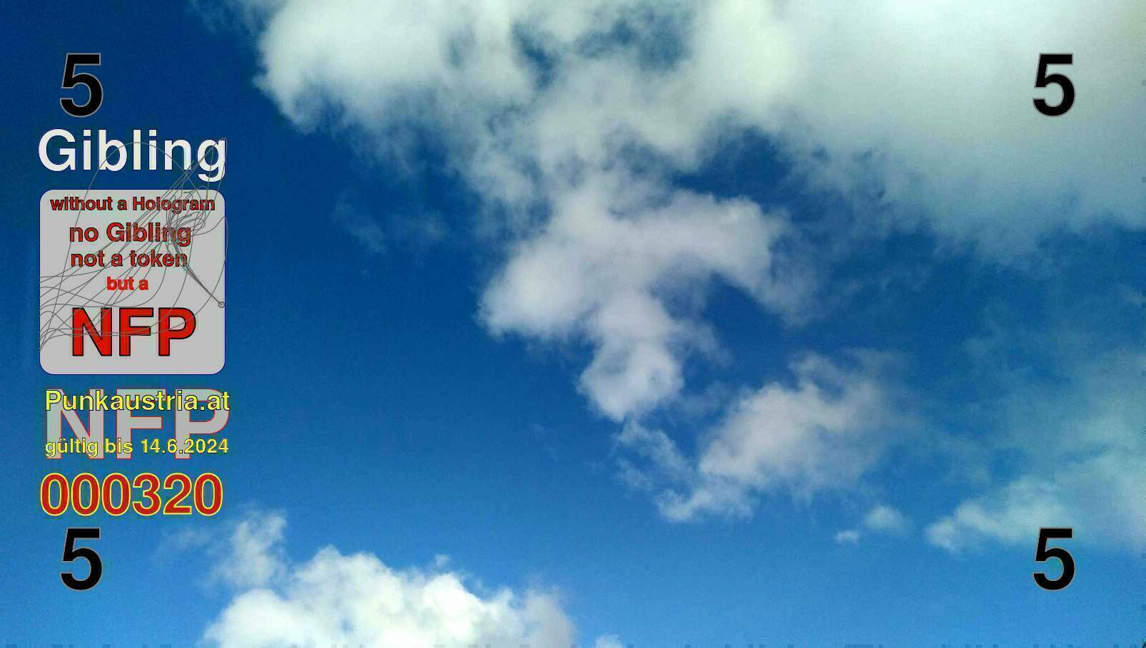 | Caption-Abstract | NFP stays for "Non Fungible Picture". The 11th Edition of our community currency Gibling is built on series of unique pictures. Each image file is unique by serial number and has a own a sha256 checksum. This data is stored in the metatags of the next picture of the series. In the metatags of the first image of the series you can find this text signed in our cryptocurrency Givecoin, created in 2014; NFPs is a fork of the Givecoin blockchain. With the NFPs we extend our ECO system in the context of process art. In this way, the Infolab of the Stadtwerkstatt wants to show another critical position on the logical truths in the new digital information society. The serial number of this image is 000320 and can also be found in the metatag "Original Transmission Reference". The checksum of the previous image is 44894173c818046f044c181acb219541891c1e467d7128a0cce16a8be2a19f05 and is also stored in the metatag: "Edit Status". Your bitcoinaddress: 151FCGoFus8osVnvkowEeZ7aevuQs3tjZz. Your Givecoinaddress:Is printed on the back of the Gibling. To keep the process open, visit https://gibling.stwst.at and follow the instructions." |