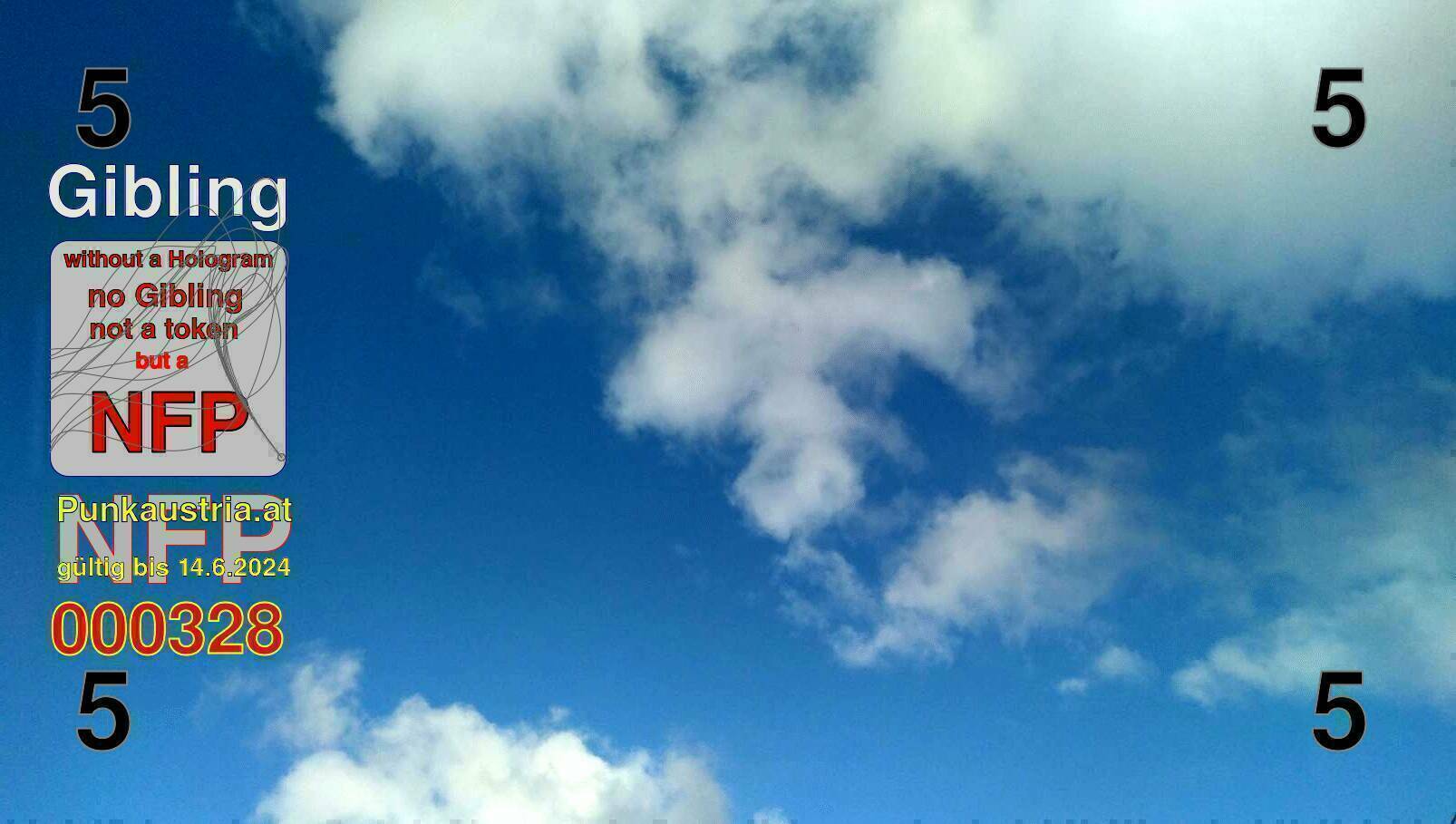 | Caption-Abstract | NFP stays for "Non Fungible Picture". The 11th Edition of our community currency Gibling is built on series of unique pictures. Each image file is unique by serial number and has a own a sha256 checksum. This data is stored in the metatags of the next picture of the series. In the metatags of the first image of the series you can find this text signed in our cryptocurrency Givecoin, created in 2014; NFPs is a fork of the Givecoin blockchain. With the NFPs we extend our ECO system in the context of process art. In this way, the Infolab of the Stadtwerkstatt wants to show another critical position on the logical truths in the new digital information society. The serial number of this image is 000328 and can also be found in the metatag "Original Transmission Reference". The checksum of the previous image is e4883d1c0a310dd165f947c5a115c9e44a42553e59707ecf3f450f4b6f1ac829 and is also stored in the metatag: "Edit Status". Your bitcoinaddress: 154firFy7zNQ8VNTbLkpJBKFcPiVN78DGn. Your Givecoinaddress:Is printed on the back of the Gibling. To keep the process open, visit https://gibling.stwst.at and follow the instructions." |