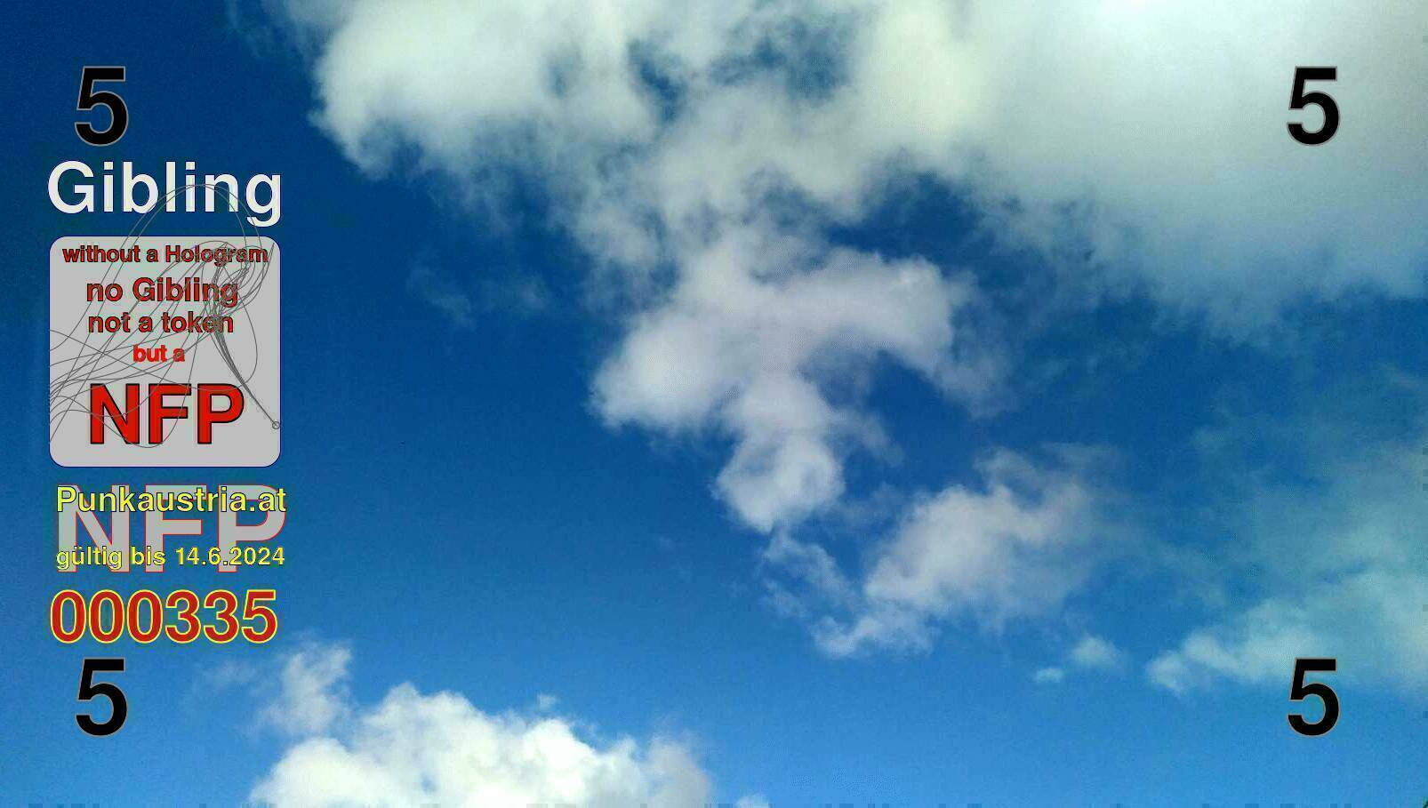 | Caption-Abstract | NFP stays for "Non Fungible Picture". The 11th Edition of our community currency Gibling is built on series of unique pictures. Each image file is unique by serial number and has a own a sha256 checksum. This data is stored in the metatags of the next picture of the series. In the metatags of the first image of the series you can find this text signed in our cryptocurrency Givecoin, created in 2014; NFPs is a fork of the Givecoin blockchain. With the NFPs we extend our ECO system in the context of process art. In this way, the Infolab of the Stadtwerkstatt wants to show another critical position on the logical truths in the new digital information society. The serial number of this image is 000335 and can also be found in the metatag "Original Transmission Reference". The checksum of the previous image is 72e6978c4c5502102cbfb0e21702d4d94d835b8102e370ced4139b99a6bc84d4 and is also stored in the metatag: "Edit Status". Your bitcoinaddress: 156zA2DNsiMeX5x8jBE7pUemu34YQn83KX. Your Givecoinaddress:Is printed on the back of the Gibling. To keep the process open, visit https://gibling.stwst.at and follow the instructions." |