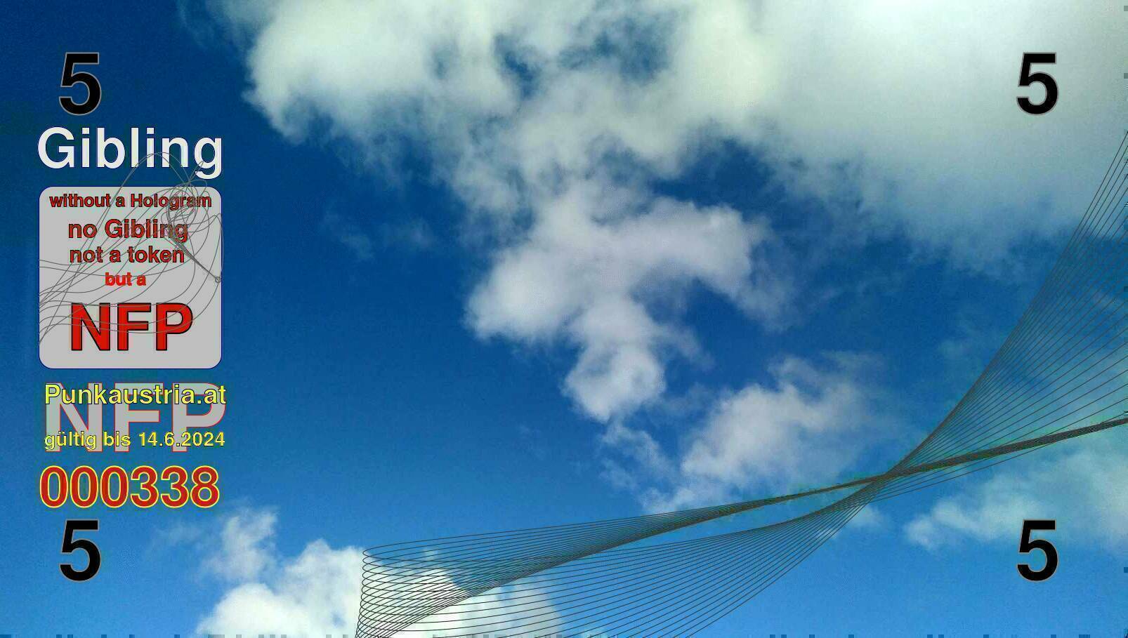 | Caption-Abstract | NFP stays for "Non Fungible Picture". The 11th Edition of our community currency Gibling is built on series of unique pictures. Each image file is unique by serial number and has a own a sha256 checksum. This data is stored in the metatags of the next picture of the series. In the metatags of the first image of the series you can find this text signed in our cryptocurrency Givecoin, created in 2014; NFPs is a fork of the Givecoin blockchain. With the NFPs we extend our ECO system in the context of process art. In this way, the Infolab of the Stadtwerkstatt wants to show another critical position on the logical truths in the new digital information society. The serial number of this image is 000338 and can also be found in the metatag "Original Transmission Reference". The checksum of the previous image is 88325e0bbe1536f016f573f1ab80158fdf2d6d63cc9b92a9b7fc3ac355b25d25 and is also stored in the metatag: "Edit Status". Your bitcoinaddress: 158DVDbLbaMG7iPgajrsevaa42AiC4WCKv. Your Givecoinaddress:Is printed on the back of the Gibling. To keep the process open, visit https://gibling.stwst.at and follow the instructions." |