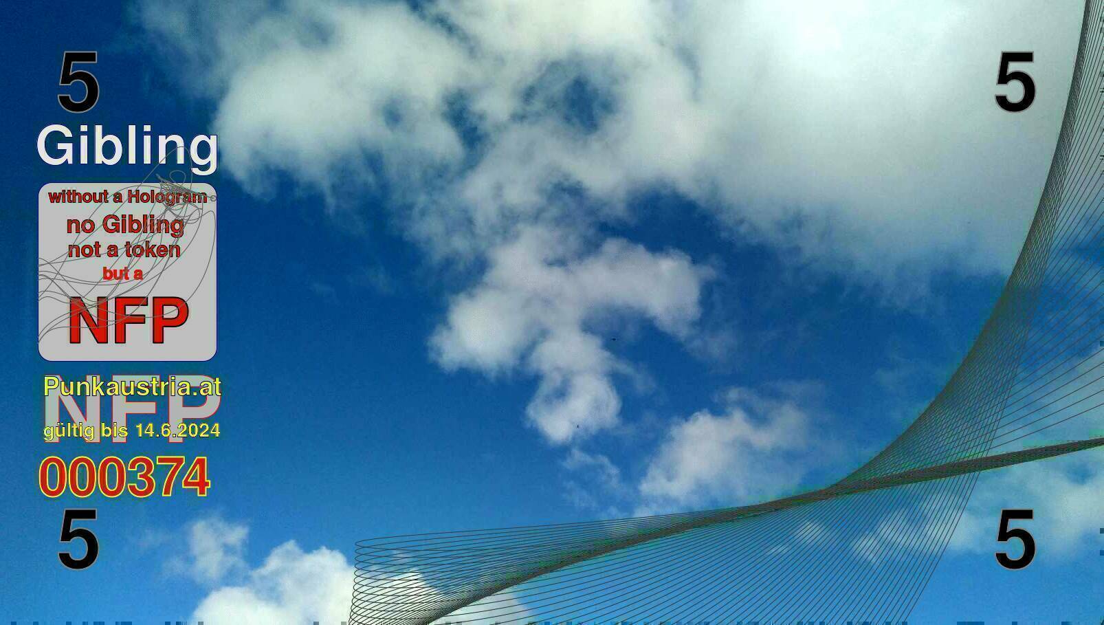 | Caption-Abstract | NFP stays for "Non Fungible Picture". The 11th Edition of our community currency Gibling is built on series of unique pictures. Each image file is unique by serial number and has a own a sha256 checksum. This data is stored in the metatags of the next picture of the series. In the metatags of the first image of the series you can find this text signed in our cryptocurrency Givecoin, created in 2014; NFPs is a fork of the Givecoin blockchain. With the NFPs we extend our ECO system in the context of process art. In this way, the Infolab of the Stadtwerkstatt wants to show another critical position on the logical truths in the new digital information society. The serial number of this image is 000374 and can also be found in the metatag "Original Transmission Reference". The checksum of the previous image is 103800de0d88b44fef86dc4b7aea5033ece4450cb99f4d8e51256ee0345f9bdf and is also stored in the metatag: "Edit Status". Your bitcoinaddress: 15XEyqmN2DmwQNS6n26GtjqwAQtaXVinHn. Your Givecoinaddress:Is printed on the back of the Gibling. To keep the process open, visit https://gibling.stwst.at and follow the instructions." |
