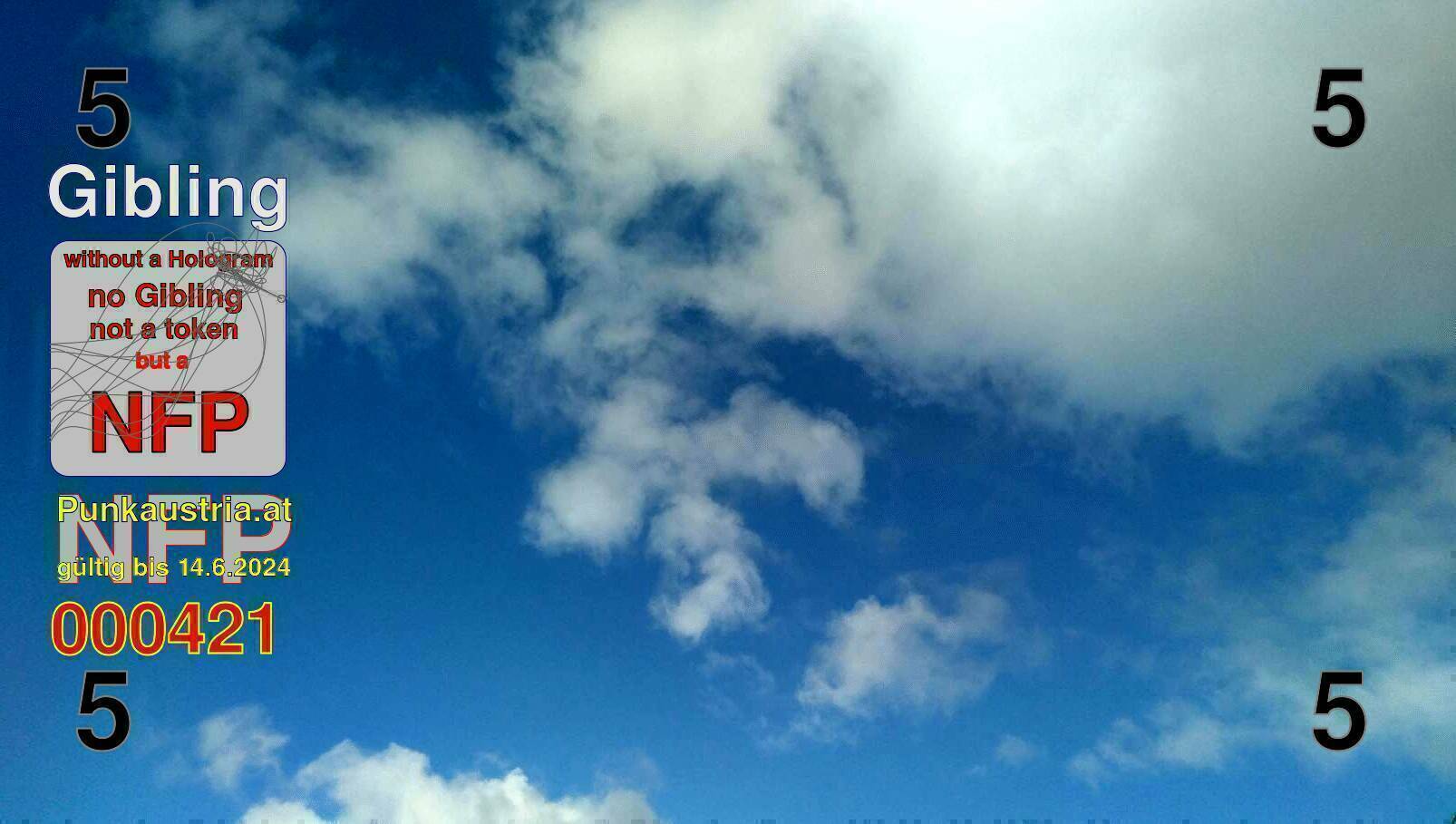 | Caption-Abstract | NFP stays for "Non Fungible Picture". The 11th Edition of our community currency Gibling is built on series of unique pictures. Each image file is unique by serial number and has a own a sha256 checksum. This data is stored in the metatags of the next picture of the series. In the metatags of the first image of the series you can find this text signed in our cryptocurrency Givecoin, created in 2014; NFPs is a fork of the Givecoin blockchain. With the NFPs we extend our ECO system in the context of process art. In this way, the Infolab of the Stadtwerkstatt wants to show another critical position on the logical truths in the new digital information society. The serial number of this image is 000421 and can also be found in the metatag "Original Transmission Reference". The checksum of the previous image is d6fd4c9c5981d199e32c46da03524e771ee12b102c53aa34a0a90c29a110da96 and is also stored in the metatag: "Edit Status". Your bitcoinaddress: 162vqxtQNjzD7MpNPF8gMfLP3dMrwTw6fH. Your Givecoinaddress:Is printed on the back of the Gibling. To keep the process open, visit https://gibling.stwst.at and follow the instructions." |
