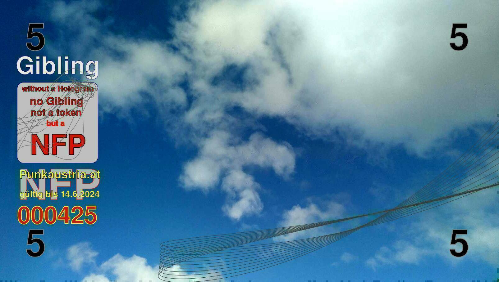 | Caption-Abstract | NFP stays for "Non Fungible Picture". The 11th Edition of our community currency Gibling is built on series of unique pictures. Each image file is unique by serial number and has a own a sha256 checksum. This data is stored in the metatags of the next picture of the series. In the metatags of the first image of the series you can find this text signed in our cryptocurrency Givecoin, created in 2014; NFPs is a fork of the Givecoin blockchain. With the NFPs we extend our ECO system in the context of process art. In this way, the Infolab of the Stadtwerkstatt wants to show another critical position on the logical truths in the new digital information society. The serial number of this image is 000425 and can also be found in the metatag "Original Transmission Reference". The checksum of the previous image is 0e1a6a0a81a8fb441abf9deaa29df21d5c5cd8a286849f03bc81b1234736bb3c and is also stored in the metatag: "Edit Status". Your bitcoinaddress: 167RR5kRsPsEfgXBdhwibN8gGqLG5ae6DM. Your Givecoinaddress:Is printed on the back of the Gibling. To keep the process open, visit https://gibling.stwst.at and follow the instructions." |