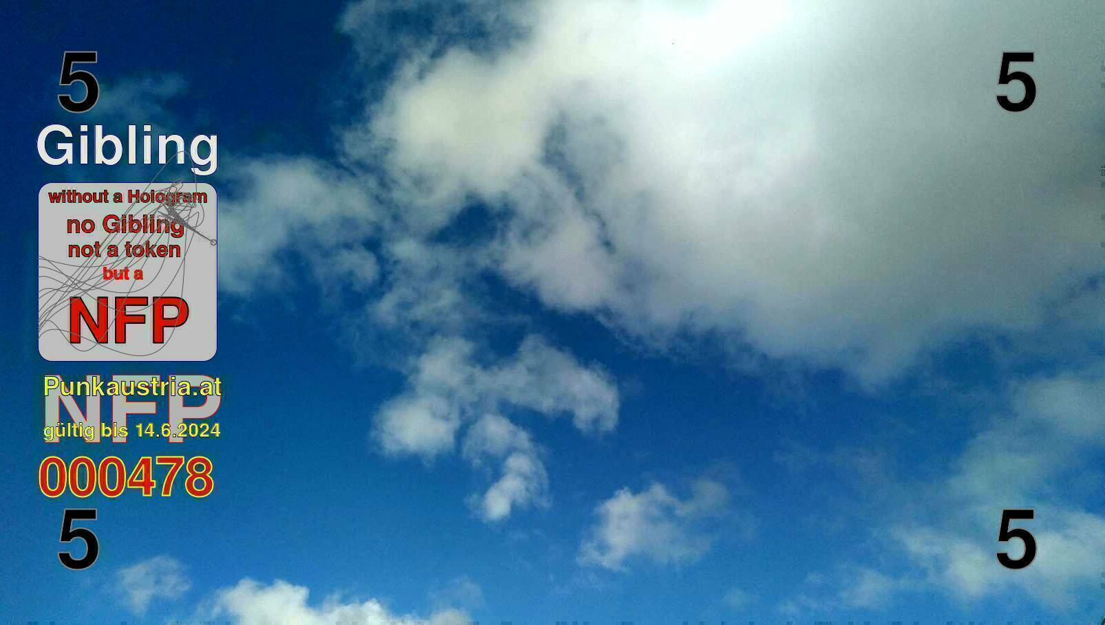 | Caption-Abstract | NFP stays for "Non Fungible Picture". The 11th Edition of our community currency Gibling is built on series of unique pictures. Each image file is unique by serial number and has a own a sha256 checksum. This data is stored in the metatags of the next picture of the series. In the metatags of the first image of the series you can find this text signed in our cryptocurrency Givecoin, created in 2014; NFPs is a fork of the Givecoin blockchain. With the NFPs we extend our ECO system in the context of process art. In this way, the Infolab of the Stadtwerkstatt wants to show another critical position on the logical truths in the new digital information society. The serial number of this image is 000478 and can also be found in the metatag "Original Transmission Reference". The checksum of the previous image is 44d1860fadb1d701763e46f934fb1ab779c4a3fdb1bcbb0f92cb38a02566dbf2 and is also stored in the metatag: "Edit Status". Your bitcoinaddress: 16fksLRsrXCZ446xsmWbtqiePNa1Zoas2m. Your Givecoinaddress:Is printed on the back of the Gibling. To keep the process open, visit https://gibling.stwst.at and follow the instructions." |