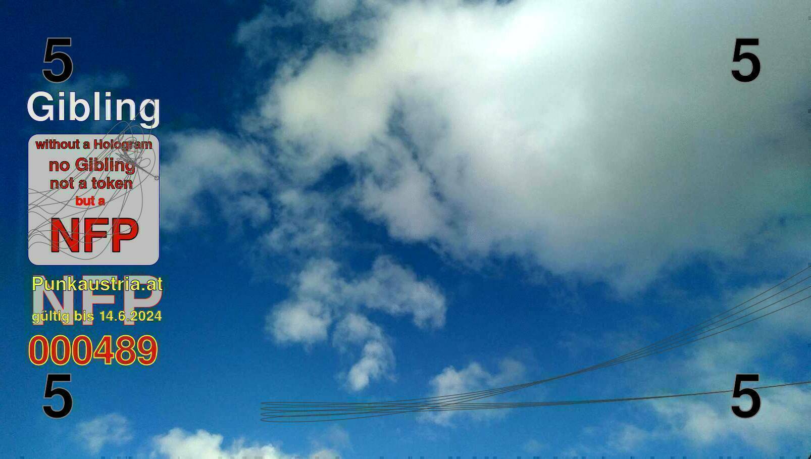 | Caption-Abstract | NFP stays for "Non Fungible Picture". The 11th Edition of our community currency Gibling is built on series of unique pictures. Each image file is unique by serial number and has a own a sha256 checksum. This data is stored in the metatags of the next picture of the series. In the metatags of the first image of the series you can find this text signed in our cryptocurrency Givecoin, created in 2014; NFPs is a fork of the Givecoin blockchain. With the NFPs we extend our ECO system in the context of process art. In this way, the Infolab of the Stadtwerkstatt wants to show another critical position on the logical truths in the new digital information society. The serial number of this image is 000489 and can also be found in the metatag "Original Transmission Reference". The checksum of the previous image is b5450770cfb5a04aed2c09eb7cac892207689accfb133d1a13ead8f68bb0ef45 and is also stored in the metatag: "Edit Status". Your bitcoinaddress: 16oF5ybxamq2BAMF8rCQq4YFK9o2miQz6D. Your Givecoinaddress:Is printed on the back of the Gibling. To keep the process open, visit https://gibling.stwst.at and follow the instructions." |