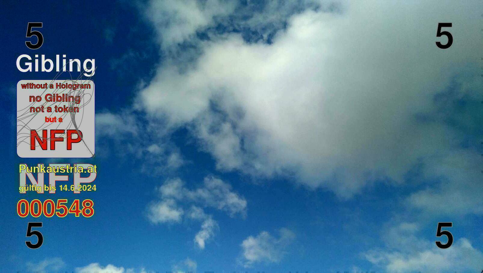 | Caption-Abstract | NFP stays for "Non Fungible Picture". The 11th Edition of our community currency Gibling is built on series of unique pictures. Each image file is unique by serial number and has a own a sha256 checksum. This data is stored in the metatags of the next picture of the series. In the metatags of the first image of the series you can find this text signed in our cryptocurrency Givecoin, created in 2014; NFPs is a fork of the Givecoin blockchain. With the NFPs we extend our ECO system in the context of process art. In this way, the Infolab of the Stadtwerkstatt wants to show another critical position on the logical truths in the new digital information society. The serial number of this image is 000548 and can also be found in the metatag "Original Transmission Reference". The checksum of the previous image is 8bf50e47d9d1a3a98821ffc21868523d52c2aef373cd15efa4919daedc5f9cef and is also stored in the metatag: "Edit Status". Your bitcoinaddress: 17U4mF2K1RPMytTDPrA2umQSeHMrVeSEsv. Your Givecoinaddress:Is printed on the back of the Gibling. To keep the process open, visit https://gibling.stwst.at and follow the instructions." |