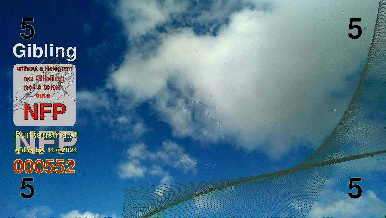| Caption-Abstract | NFP stays for "Non Fungible Picture". The 11th Edition of our community currency Gibling is built on series of unique pictures. Each image file is unique by serial number and has a own a sha256 checksum. This data is stored in the metatags of the next picture of the series. In the metatags of the first image of the series you can find this text signed in our cryptocurrency Givecoin, created in 2014; NFPs is a fork of the Givecoin blockchain. With the NFPs we extend our ECO system in the context of process art. In this way, the Infolab of the Stadtwerkstatt wants to show another critical position on the logical truths in the new digital information society. The serial number of this image is 000552 and can also be found in the metatag "Original Transmission Reference". The checksum of the previous image is 7a3a58c177491bd8e8cb5983ed1657e7e3d964bb4f2290743d9303950fb3834b and is also stored in the metatag: "Edit Status". Your bitcoinaddress: 17ZgEqfnqSjUmoqg4YvXaSFEieprYk3XsE. Your Givecoinaddress:Is printed on the back of the Gibling. To keep the process open, visit https://gibling.stwst.at and follow the instructions." |