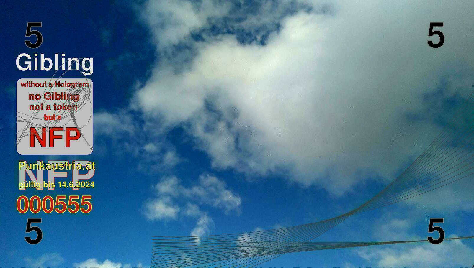 | Caption-Abstract | NFP stays for "Non Fungible Picture". The 11th Edition of our community currency Gibling is built on series of unique pictures. Each image file is unique by serial number and has a own a sha256 checksum. This data is stored in the metatags of the next picture of the series. In the metatags of the first image of the series you can find this text signed in our cryptocurrency Givecoin, created in 2014; NFPs is a fork of the Givecoin blockchain. With the NFPs we extend our ECO system in the context of process art. In this way, the Infolab of the Stadtwerkstatt wants to show another critical position on the logical truths in the new digital information society. The serial number of this image is 000555 and can also be found in the metatag "Original Transmission Reference". The checksum of the previous image is 990c43a7a7dc4abf5cab01f19a344d993ace3fff635bd8b4b6b70a835c936ecb and is also stored in the metatag: "Edit Status". Your bitcoinaddress: 17aojBG23Jst9CBU7bT6ASWknt9znD2hE1. Your Givecoinaddress:Is printed on the back of the Gibling. To keep the process open, visit https://gibling.stwst.at and follow the instructions." |