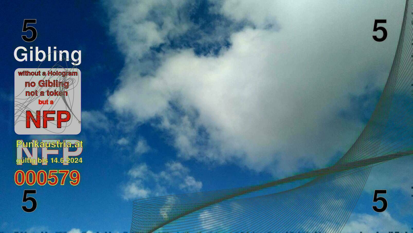 | Caption-Abstract | NFP stays for "Non Fungible Picture". The 11th Edition of our community currency Gibling is built on series of unique pictures. Each image file is unique by serial number and has a own a sha256 checksum. This data is stored in the metatags of the next picture of the series. In the metatags of the first image of the series you can find this text signed in our cryptocurrency Givecoin, created in 2014; NFPs is a fork of the Givecoin blockchain. With the NFPs we extend our ECO system in the context of process art. In this way, the Infolab of the Stadtwerkstatt wants to show another critical position on the logical truths in the new digital information society. The serial number of this image is 000579 and can also be found in the metatag "Original Transmission Reference". The checksum of the previous image is 1a2f3471c50d16d7269af2f1ccfb228e52f89f41209dba325312ef4aeac258f4 and is also stored in the metatag: "Edit Status". Your bitcoinaddress: 17oWr2WiMsknWDZTveoboF5aHS8idLDhVp. Your Givecoinaddress:Is printed on the back of the Gibling. To keep the process open, visit https://gibling.stwst.at and follow the instructions." |