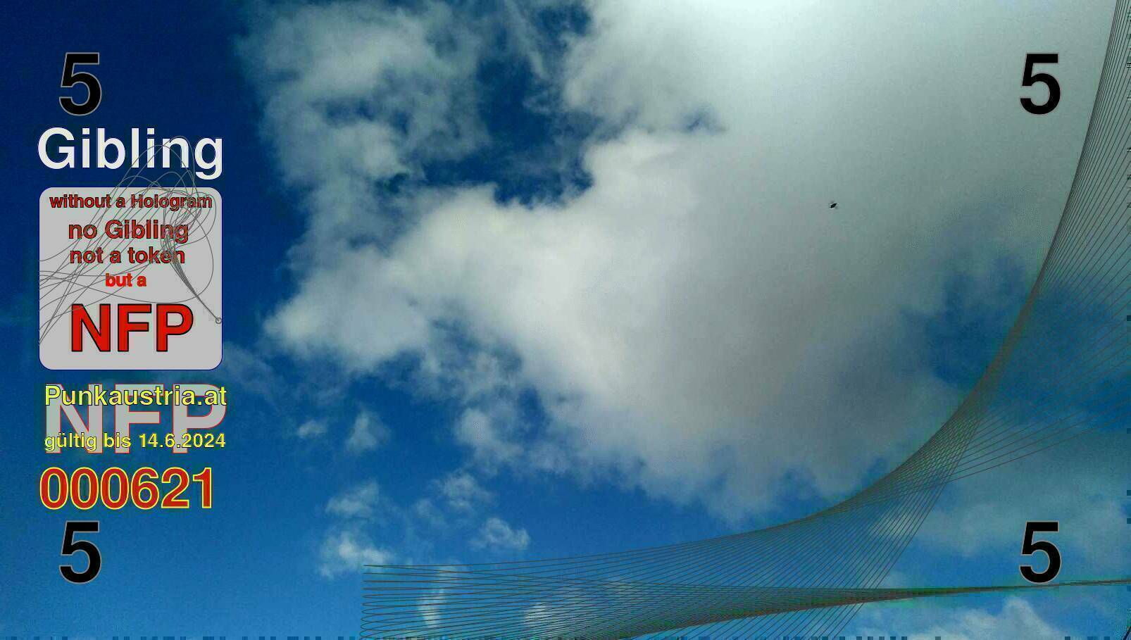 | Caption-Abstract | NFP stays for "Non Fungible Picture". The 11th Edition of our community currency Gibling is built on series of unique pictures. Each image file is unique by serial number and has a own a sha256 checksum. This data is stored in the metatags of the next picture of the series. In the metatags of the first image of the series you can find this text signed in our cryptocurrency Givecoin, created in 2014; NFPs is a fork of the Givecoin blockchain. With the NFPs we extend our ECO system in the context of process art. In this way, the Infolab of the Stadtwerkstatt wants to show another critical position on the logical truths in the new digital information society. The serial number of this image is 000621 and can also be found in the metatag "Original Transmission Reference". The checksum of the previous image is 79de56a4e53a960813c53b688cc847e46a13d35b0cef7228a89fe680813a4e2e and is also stored in the metatag: "Edit Status". Your bitcoinaddress: 18F5uvQKoAqwY4LUkLAkLVcFeZdC9Nek3m. Your Givecoinaddress:Is printed on the back of the Gibling. To keep the process open, visit https://gibling.stwst.at and follow the instructions." |