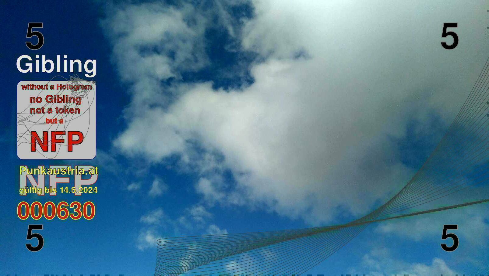 | Caption-Abstract | NFP stays for "Non Fungible Picture". The 11th Edition of our community currency Gibling is built on series of unique pictures. Each image file is unique by serial number and has a own a sha256 checksum. This data is stored in the metatags of the next picture of the series. In the metatags of the first image of the series you can find this text signed in our cryptocurrency Givecoin, created in 2014; NFPs is a fork of the Givecoin blockchain. With the NFPs we extend our ECO system in the context of process art. In this way, the Infolab of the Stadtwerkstatt wants to show another critical position on the logical truths in the new digital information society. The serial number of this image is 000630 and can also be found in the metatag "Original Transmission Reference". The checksum of the previous image is 068d4d7e6d670bff29d81f2bad5b07462cbc347ba782b650d8a1b3073e2fbcb5 and is also stored in the metatag: "Edit Status". Your bitcoinaddress: 18LW7H49Jd82mGSPgUXbLqqqfrEXcqbxGc. Your Givecoinaddress:Is printed on the back of the Gibling. To keep the process open, visit https://gibling.stwst.at and follow the instructions." |