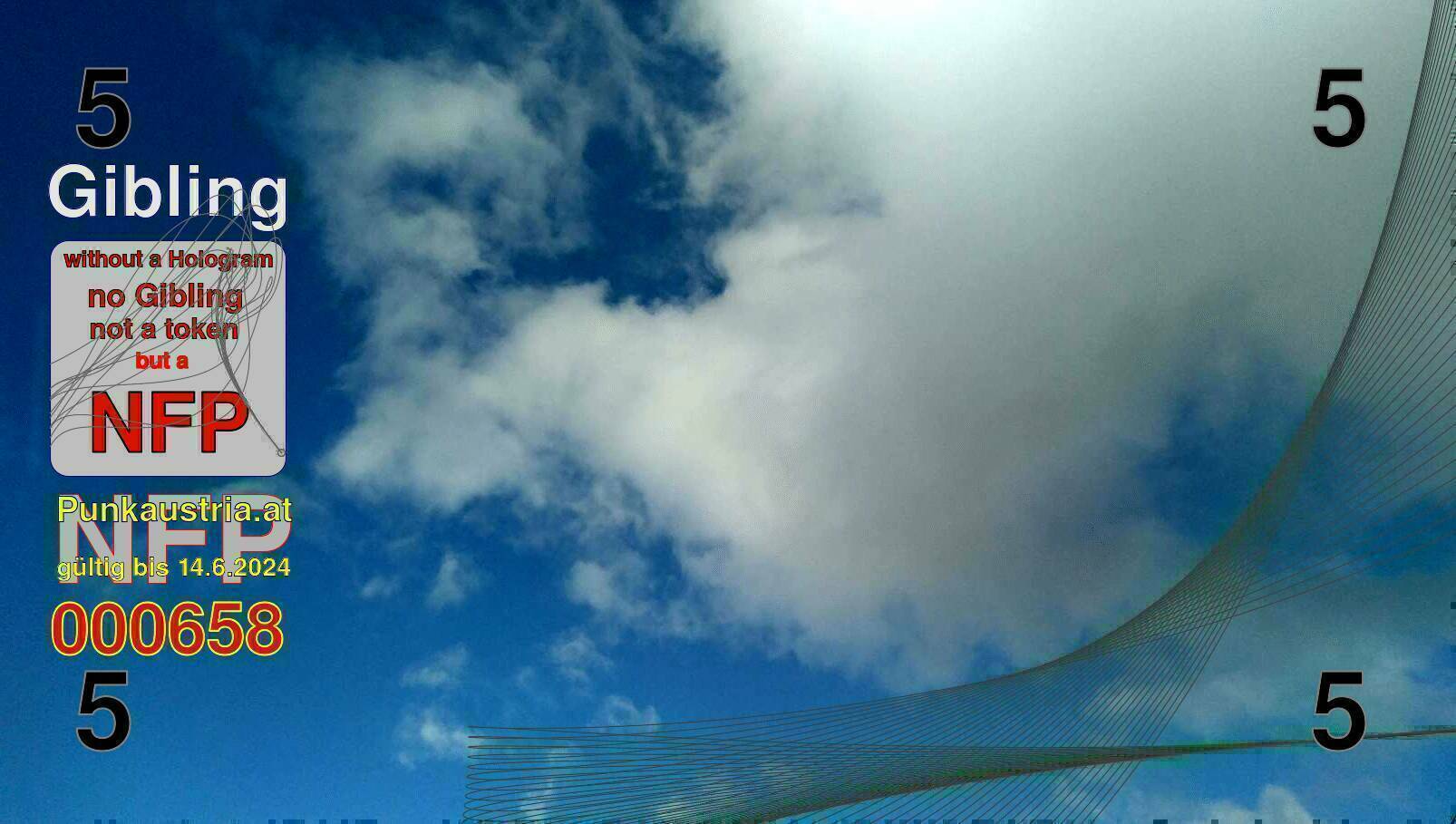 | Caption-Abstract | NFP stays for "Non Fungible Picture". The 11th Edition of our community currency Gibling is built on series of unique pictures. Each image file is unique by serial number and has a own a sha256 checksum. This data is stored in the metatags of the next picture of the series. In the metatags of the first image of the series you can find this text signed in our cryptocurrency Givecoin, created in 2014; NFPs is a fork of the Givecoin blockchain. With the NFPs we extend our ECO system in the context of process art. In this way, the Infolab of the Stadtwerkstatt wants to show another critical position on the logical truths in the new digital information society. The serial number of this image is 000658 and can also be found in the metatag "Original Transmission Reference". The checksum of the previous image is cda086f7a33b1fa3630369091a4c62d069f526796ea0af388d8df0f9388058cf and is also stored in the metatag: "Edit Status". Your bitcoinaddress: 18c1ms8zy9gpha4zCuAtdC7Ff19q7oYQJ8. Your Givecoinaddress:Is printed on the back of the Gibling. To keep the process open, visit https://gibling.stwst.at and follow the instructions." |