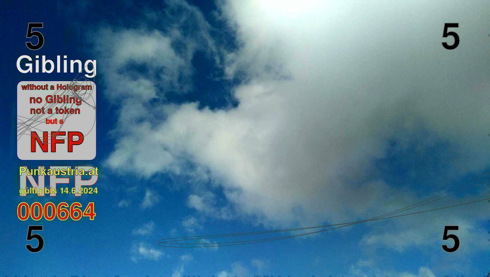 | Caption-Abstract | NFP stays for "Non Fungible Picture". The 11th Edition of our community currency Gibling is built on series of unique pictures. Each image file is unique by serial number and has a own a sha256 checksum. This data is stored in the metatags of the next picture of the series. In the metatags of the first image of the series you can find this text signed in our cryptocurrency Givecoin, created in 2014; NFPs is a fork of the Givecoin blockchain. With the NFPs we extend our ECO system in the context of process art. In this way, the Infolab of the Stadtwerkstatt wants to show another critical position on the logical truths in the new digital information society. The serial number of this image is 000664 and can also be found in the metatag "Original Transmission Reference". The checksum of the previous image is 3e005216ec85166205e3756266a85290925cbba2167ded30ea6287a9c7a2a176 and is also stored in the metatag: "Edit Status". Your bitcoinaddress: 18fMswJwqnQe63vAo2EHWZ9s9QhFm6sbpD. Your Givecoinaddress:Is printed on the back of the Gibling. To keep the process open, visit https://gibling.stwst.at and follow the instructions." |