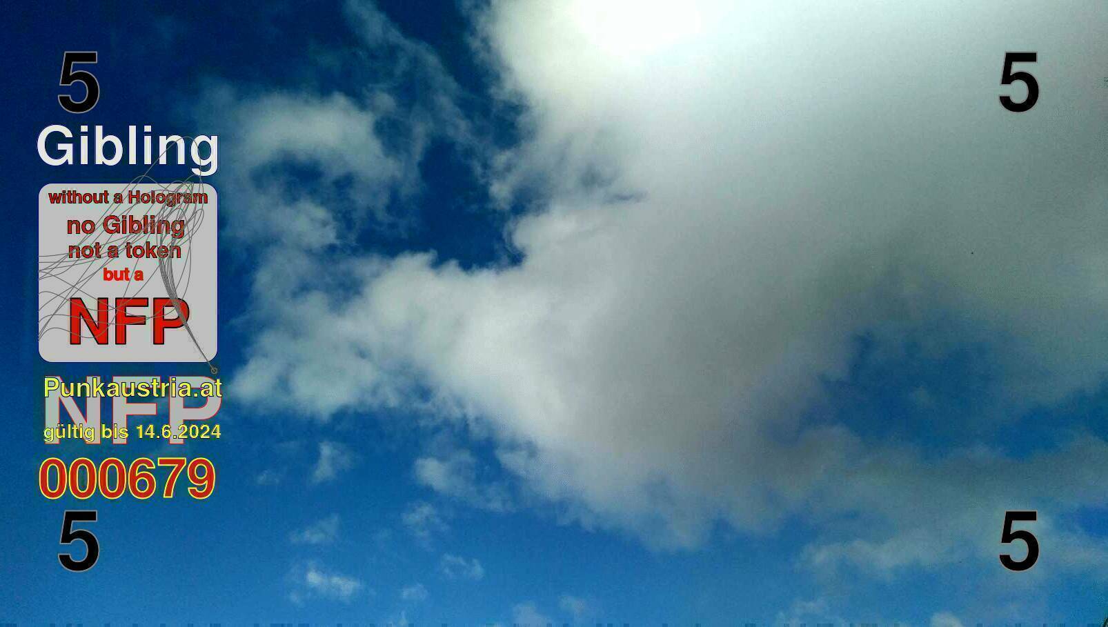 | Caption-Abstract | NFP stays for "Non Fungible Picture". The 11th Edition of our community currency Gibling is built on series of unique pictures. Each image file is unique by serial number and has a own a sha256 checksum. This data is stored in the metatags of the next picture of the series. In the metatags of the first image of the series you can find this text signed in our cryptocurrency Givecoin, created in 2014; NFPs is a fork of the Givecoin blockchain. With the NFPs we extend our ECO system in the context of process art. In this way, the Infolab of the Stadtwerkstatt wants to show another critical position on the logical truths in the new digital information society. The serial number of this image is 000679 and can also be found in the metatag "Original Transmission Reference". The checksum of the previous image is 4f2d45308f1d8e90a58c1afbb37723c9a83a54c5141fedaf0f20913aa11cc901 and is also stored in the metatag: "Edit Status". Your bitcoinaddress: 18khQSkxeLLAL86GPxczUtSi1rkufuPhhj. Your Givecoinaddress:Is printed on the back of the Gibling. To keep the process open, visit https://gibling.stwst.at and follow the instructions." |