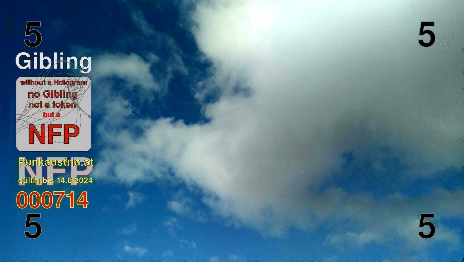| Caption-Abstract | NFP stays for "Non Fungible Picture". The 11th Edition of our community currency Gibling is built on series of unique pictures. Each image file is unique by serial number and has a own a sha256 checksum. This data is stored in the metatags of the next picture of the series. In the metatags of the first image of the series you can find this text signed in our cryptocurrency Givecoin, created in 2014; NFPs is a fork of the Givecoin blockchain. With the NFPs we extend our ECO system in the context of process art. In this way, the Infolab of the Stadtwerkstatt wants to show another critical position on the logical truths in the new digital information society. The serial number of this image is 000714 and can also be found in the metatag "Original Transmission Reference". The checksum of the previous image is f2c7644cd2fba19b715ab16ad285bdead72c60fb96c226dd4b7514ffa08ca820 and is also stored in the metatag: "Edit Status". Your bitcoinaddress: 199yvjMzBZqWRQg32SU5uij7JMwsZkksYe. Your Givecoinaddress:Is printed on the back of the Gibling. To keep the process open, visit https://gibling.stwst.at and follow the instructions." |
