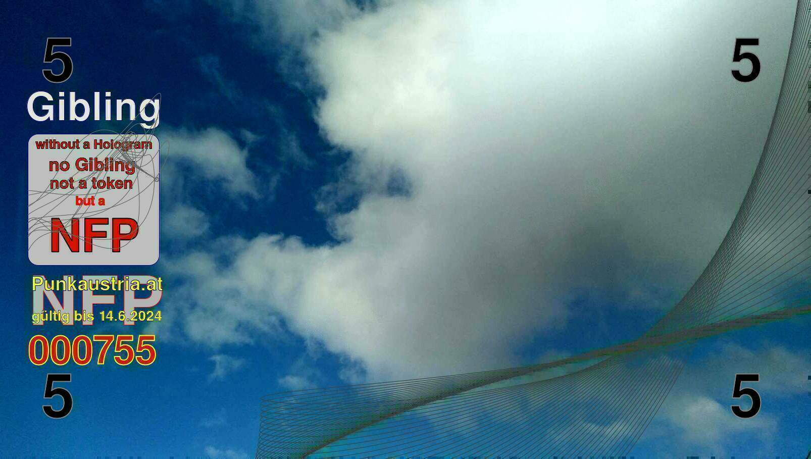| Caption-Abstract | NFP stays for "Non Fungible Picture". The 11th Edition of our community currency Gibling is built on series of unique pictures. Each image file is unique by serial number and has a own a sha256 checksum. This data is stored in the metatags of the next picture of the series. In the metatags of the first image of the series you can find this text signed in our cryptocurrency Givecoin, created in 2014; NFPs is a fork of the Givecoin blockchain. With the NFPs we extend our ECO system in the context of process art. In this way, the Infolab of the Stadtwerkstatt wants to show another critical position on the logical truths in the new digital information society. The serial number of this image is 000755 and can also be found in the metatag "Original Transmission Reference". The checksum of the previous image is 185f581ba69f227a6755500b4197a19b850c60ed4c4fc31f6443b8a99149d7be and is also stored in the metatag: "Edit Status". Your bitcoinaddress: 19gtTisoQK1d2T16GB91zg9wNzEpVv5yCQ. Your Givecoinaddress:Is printed on the back of the Gibling. To keep the process open, visit https://gibling.stwst.at and follow the instructions." |