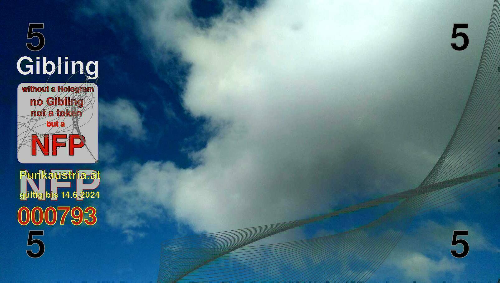 | Caption-Abstract | NFP stays for "Non Fungible Picture". The 11th Edition of our community currency Gibling is built on series of unique pictures. Each image file is unique by serial number and has a own a sha256 checksum. This data is stored in the metatags of the next picture of the series. In the metatags of the first image of the series you can find this text signed in our cryptocurrency Givecoin, created in 2014; NFPs is a fork of the Givecoin blockchain. With the NFPs we extend our ECO system in the context of process art. In this way, the Infolab of the Stadtwerkstatt wants to show another critical position on the logical truths in the new digital information society. The serial number of this image is 000793 and can also be found in the metatag "Original Transmission Reference". The checksum of the previous image is 0a7e2a3c9b4d6f283282282eddf783f86bf5e98d30fa7d2d85191edb4f4703ca and is also stored in the metatag: "Edit Status". Your bitcoinaddress: 19xWTpSHE9ocDymR1FFst6GQw6b6vNvGzj. Your Givecoinaddress:Is printed on the back of the Gibling. To keep the process open, visit https://gibling.stwst.at and follow the instructions." |