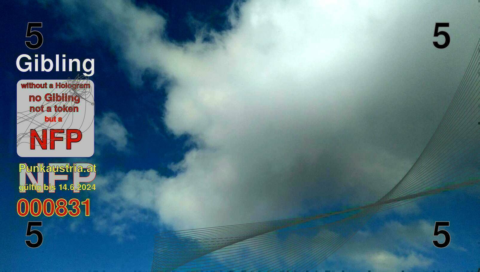 | Caption-Abstract | NFP stays for "Non Fungible Picture". The 11th Edition of our community currency Gibling is built on series of unique pictures. Each image file is unique by serial number and has a own a sha256 checksum. This data is stored in the metatags of the next picture of the series. In the metatags of the first image of the series you can find this text signed in our cryptocurrency Givecoin, created in 2014; NFPs is a fork of the Givecoin blockchain. With the NFPs we extend our ECO system in the context of process art. In this way, the Infolab of the Stadtwerkstatt wants to show another critical position on the logical truths in the new digital information society. The serial number of this image is 000831 and can also be found in the metatag "Original Transmission Reference". The checksum of the previous image is 0288e20bffad925b9dbb75e7ecb71fed1e62f23a5719a8e07ec250edf185d0fe and is also stored in the metatag: "Edit Status". Your bitcoinaddress: 1AQRLr4dCyiMbebrf1MgNdCamKN6LZxWaT. Your Givecoinaddress:Is printed on the back of the Gibling. To keep the process open, visit https://gibling.stwst.at and follow the instructions." |