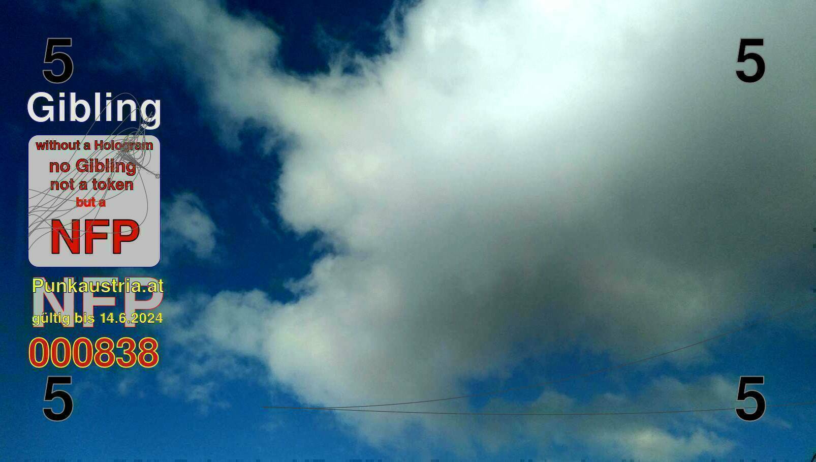| Caption-Abstract | NFP stays for "Non Fungible Picture". The 11th Edition of our community currency Gibling is built on series of unique pictures. Each image file is unique by serial number and has a own a sha256 checksum. This data is stored in the metatags of the next picture of the series. In the metatags of the first image of the series you can find this text signed in our cryptocurrency Givecoin, created in 2014; NFPs is a fork of the Givecoin blockchain. With the NFPs we extend our ECO system in the context of process art. In this way, the Infolab of the Stadtwerkstatt wants to show another critical position on the logical truths in the new digital information society. The serial number of this image is 000838 and can also be found in the metatag "Original Transmission Reference". The checksum of the previous image is 6b16cfd305454aaf2829846a84099bc5edb70ac9a7a576b7893c695376662fc4 and is also stored in the metatag: "Edit Status". Your bitcoinaddress: 1AU98PHU6AkziJYgAvwas5T5aEwrMKUWhG. Your Givecoinaddress:Is printed on the back of the Gibling. To keep the process open, visit https://gibling.stwst.at and follow the instructions." |